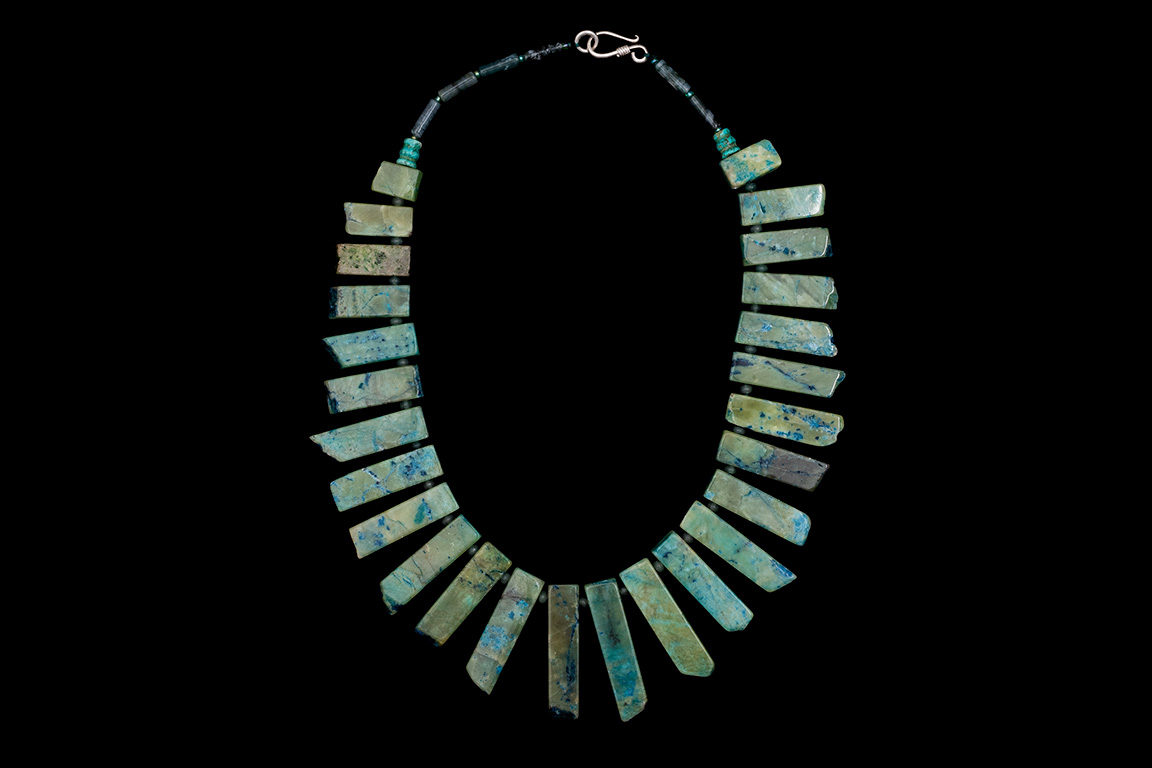 A necklace of twenty-six mottled light green and blue Jadeite thin graduated rectangular drops, with small green Onyx round spacers and beads. The largest rectangular drop is 0.3 inches in width, 0.1 inches in depth, and 1.5 inches in drop length. The shortest drop is 0.3 inches in width, 0.1 inches in depth, and 0.6 inches in drop length. The necklace is 19 inches in length, and is finished with a Silver Plated ‘S’ hook and ring.
