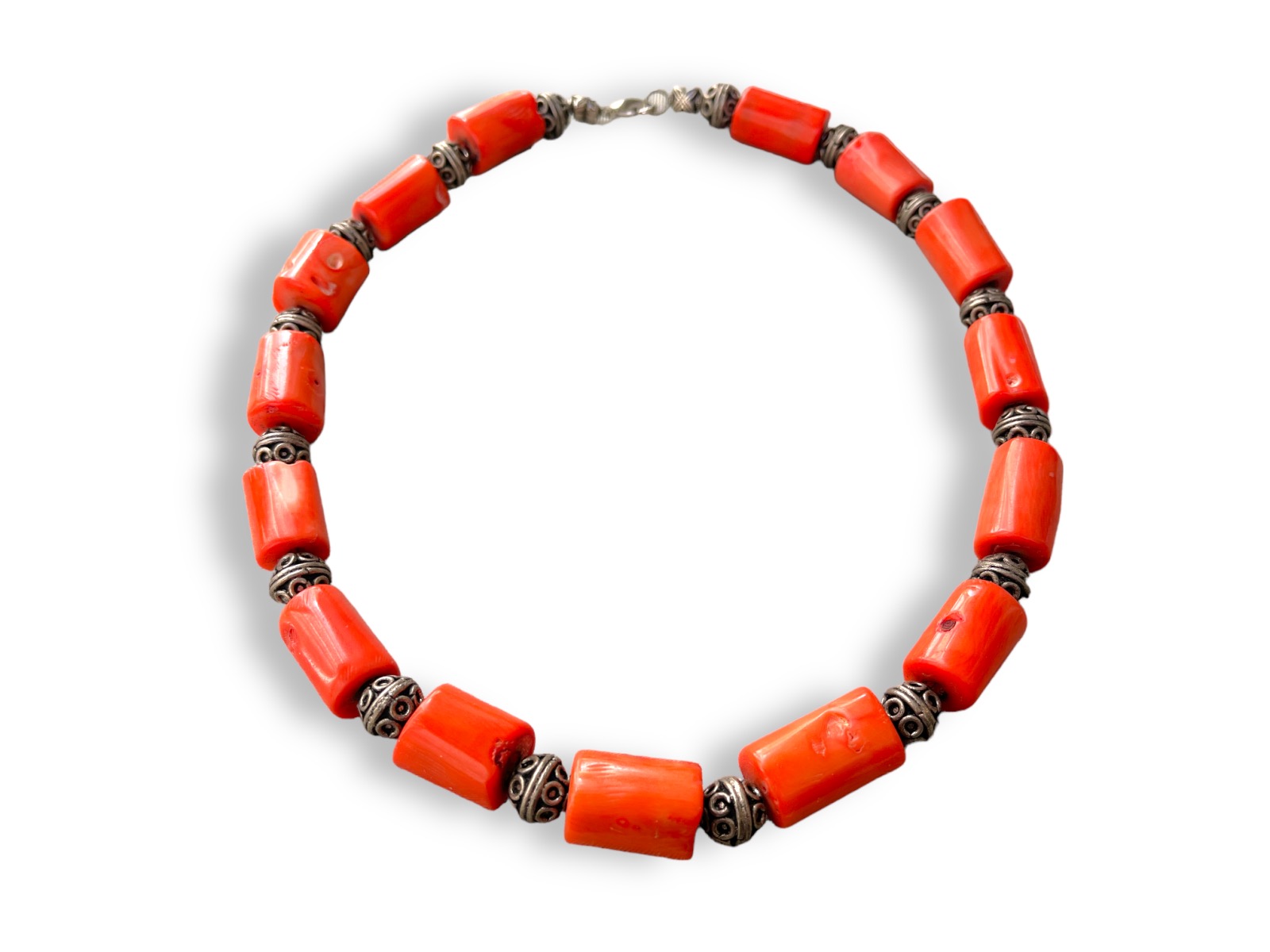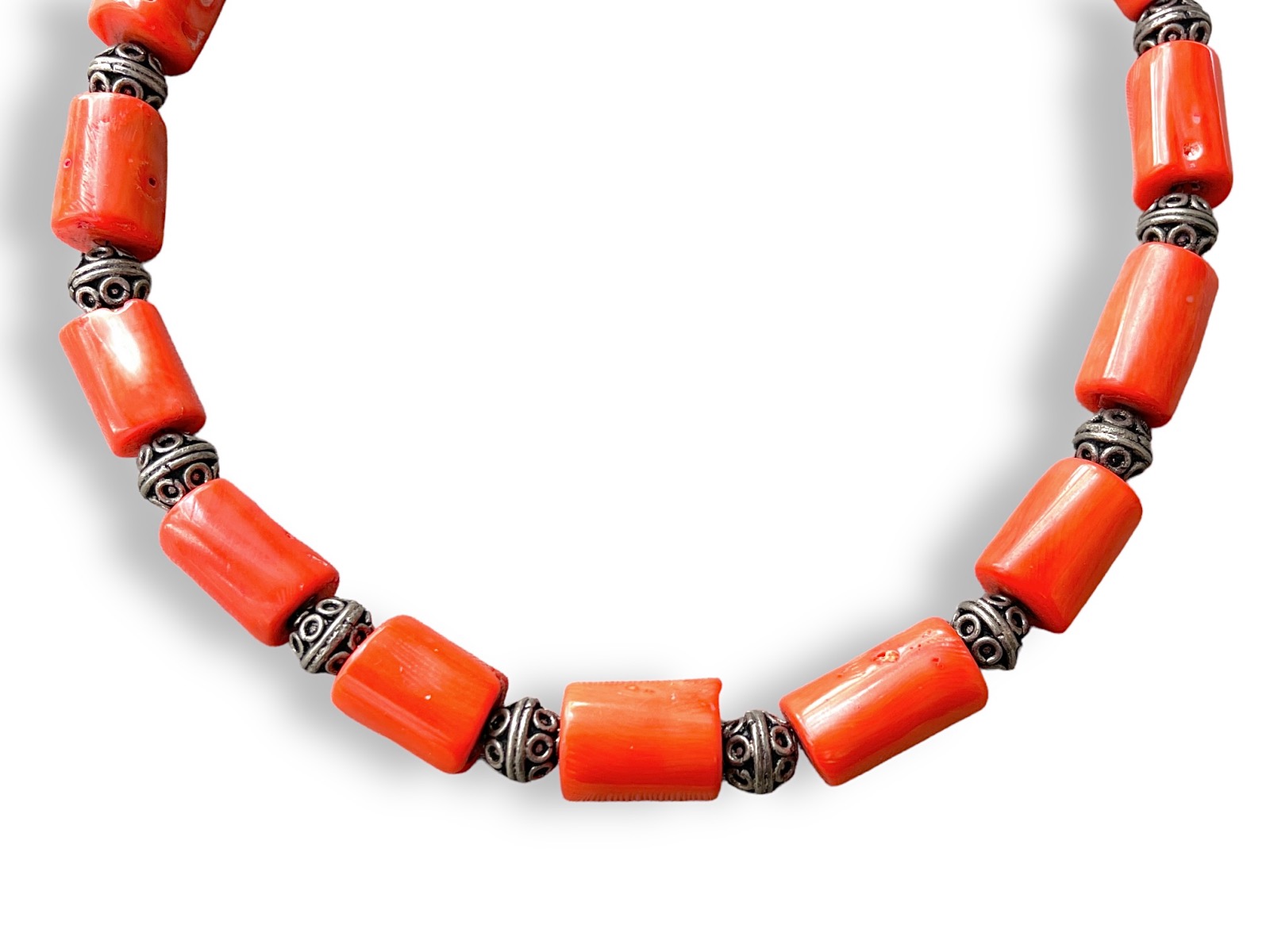 A necklace of fifteen orange dyed Sea Bamboo Coral tubular beads, and sixteen small round filigree patterned Brass beads. At each end of the necklace is a small Silvered Metal square bead with a cross pattern. Each tubular bead is 2 cm in length and 1.2 cm in diameter. Each round Brass bead is 1 cm in diameter. The necklace is 48 cm in length, and is finished with a Silver Plated oyster clasp and ring.