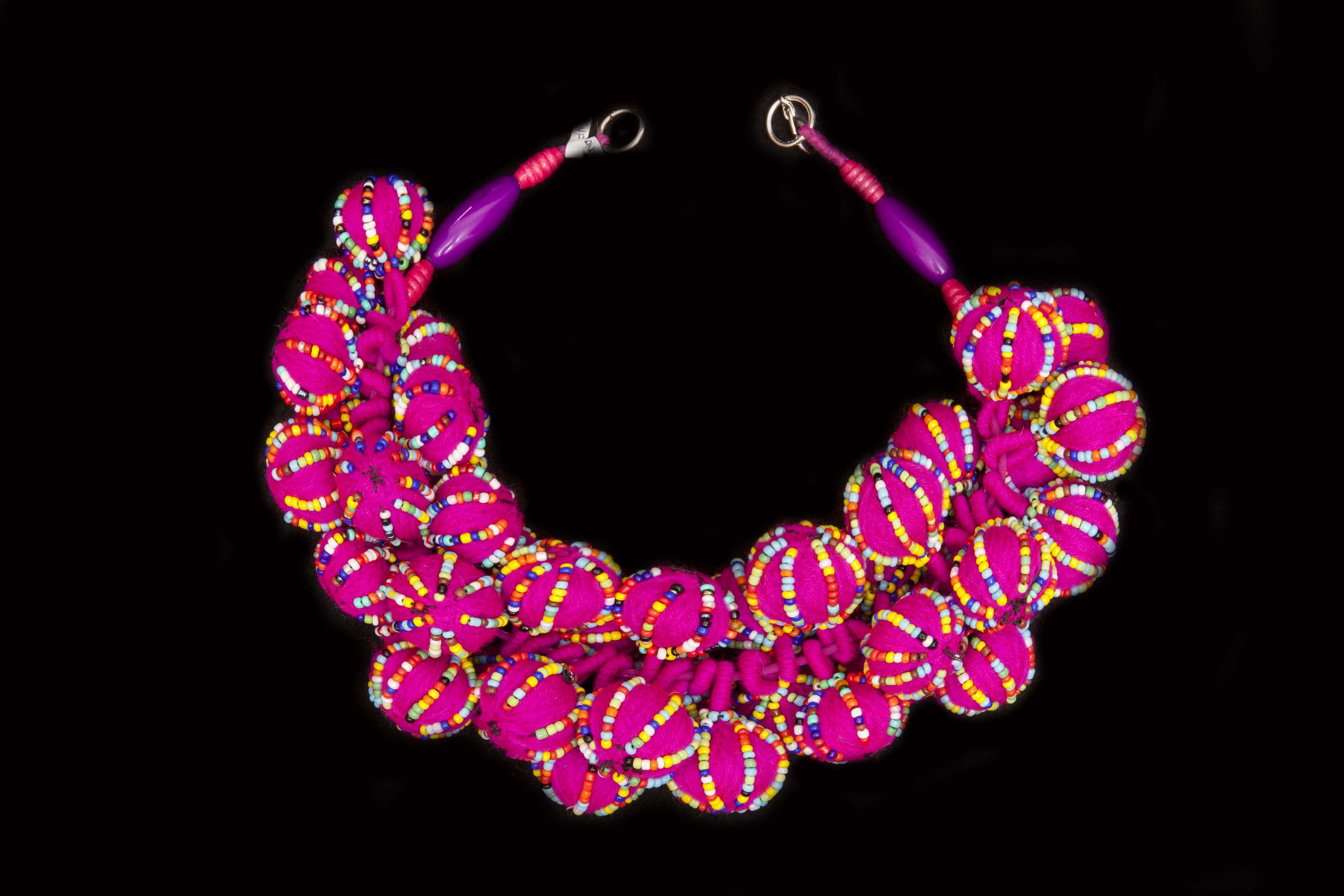 A necklace of forty-three bright pink Wool covered round bunched beads, each bead decorated with lines of small multicoloured Glass beads. At each end of the necklace are two bright pink painted Wood grooved oval beads and, between them, a large purple Resin oval bead. Each Wool bead is, approximately, 1.1 inches in diameter. The necklace is 20 inches in length, and is finished with a Silvered Metal, (Nickel free), oyster clasp and rings.