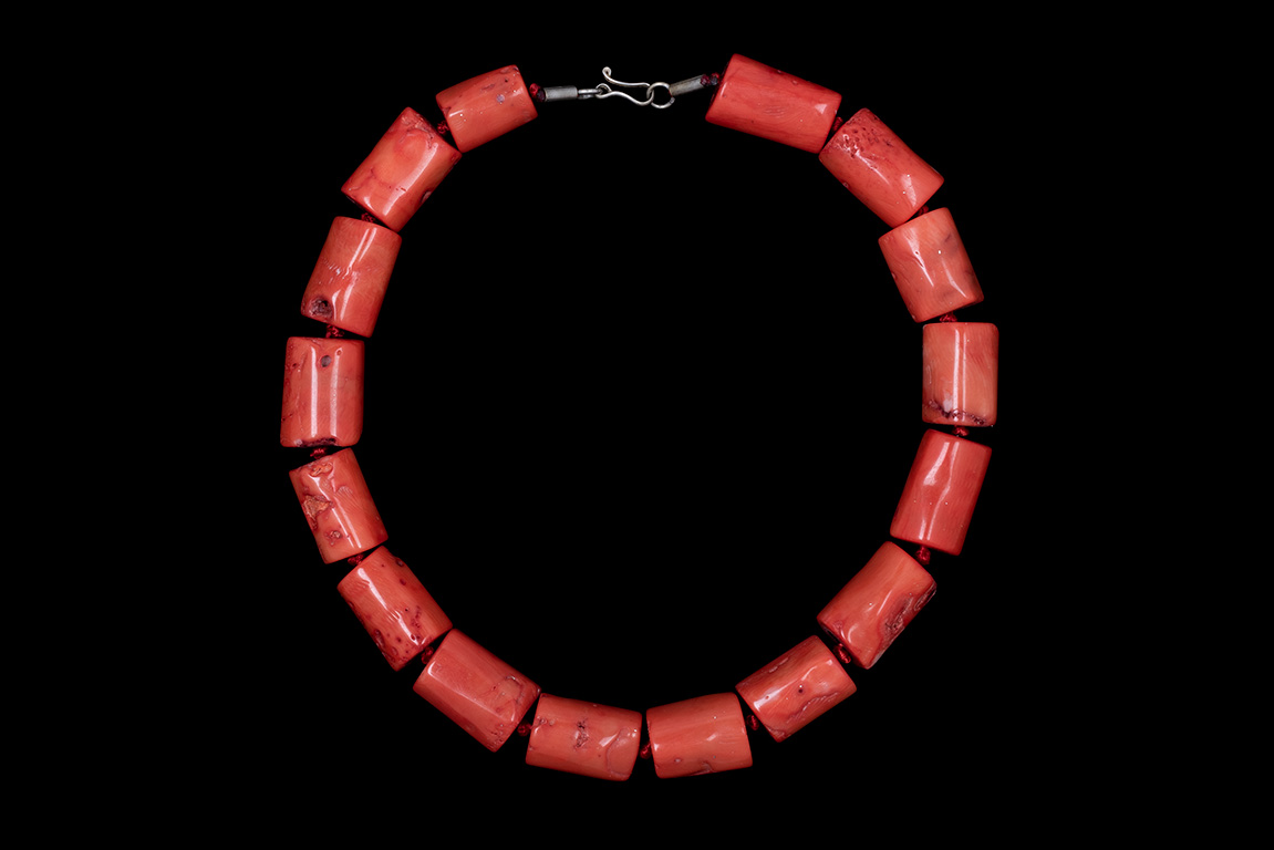 A necklace of sixteen orange dyed Sea Bamboo Coral tubular beads with an orange silk knotted spacer between each Coral bead. The longest tubular bead is 0.5 inches in diameter and 1.2 inches in length. The shortest tubular bead is 0.5 inches in diameter and 0.7 inches in length. The necklace is 20.2 inches in length, and is finished with a Silver hook and ring, both at the ends of small Silver tubes.