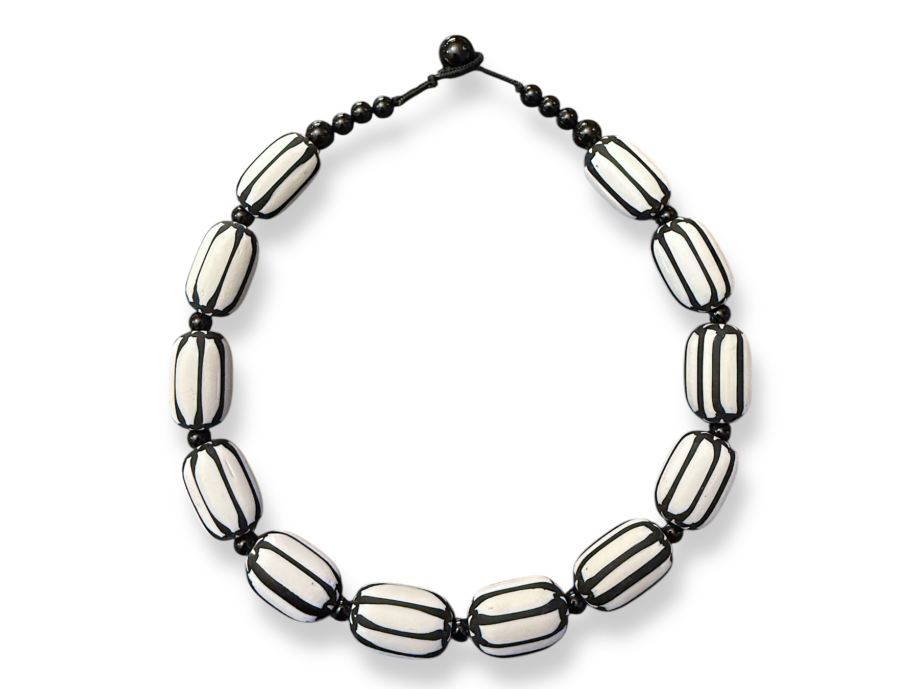 A necklace of twelve white Glass chevron barrel beads with black Glass narrow stripes, and small Black Onyx round spacers and beads. Each chevron bead is 1.5 cm in diameter, and 2.5 cm in length. The necklace is 45 cm in length, and is attached by a black Cotton macrame loop, and a Black Onyx round toggle.