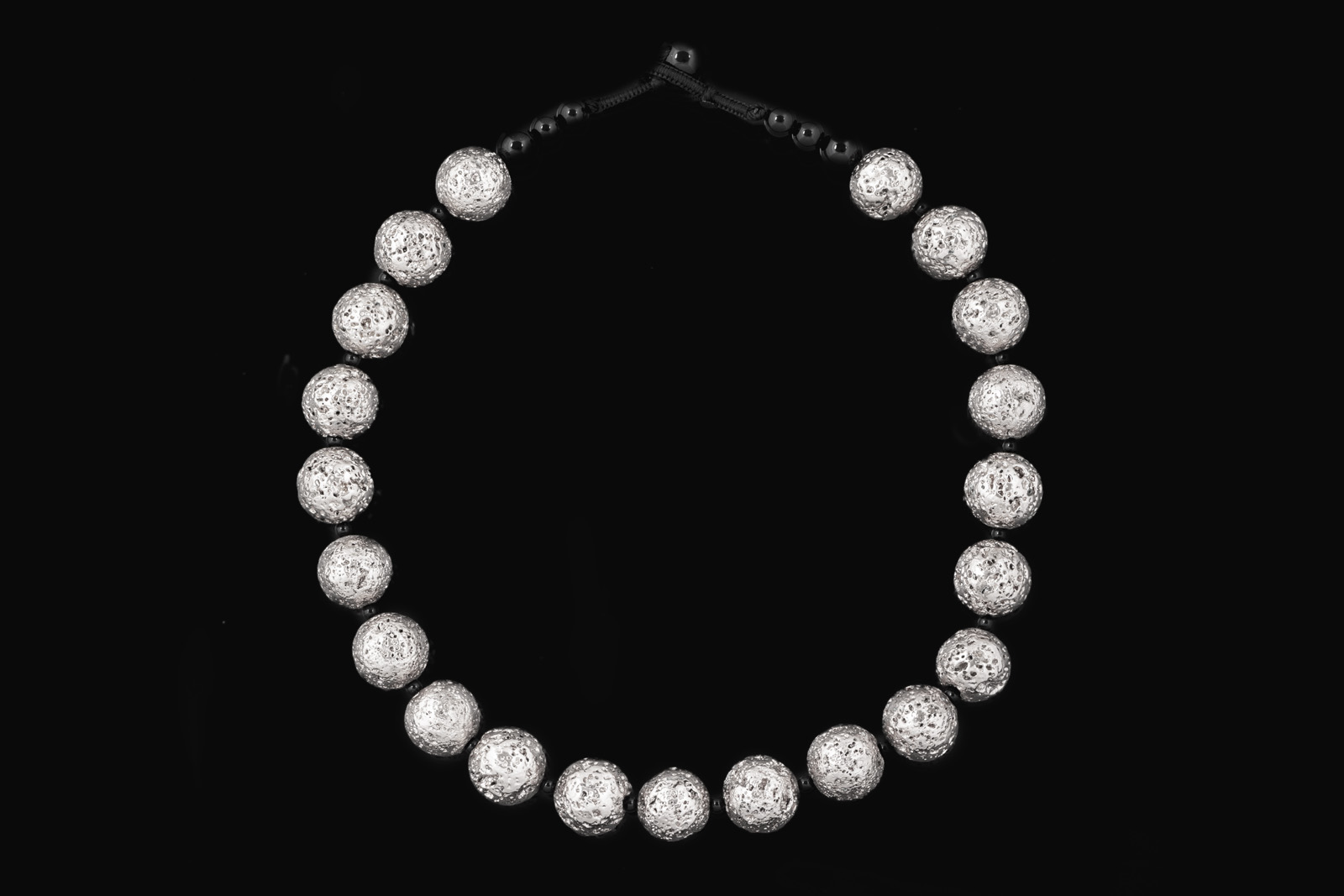 A necklace of twenty-one Silver electroplated Lava round pitted ‘moon’ beads with Black Onyx small round spacers and beads. At each end of the necklace is a row of three Black Onyx round beads. Each Silver bead is 0.4 inches in diameter. The necklace is 17 inches in length, and is finished with a black cotton macrame loop, and a Black Onyx round toggle.