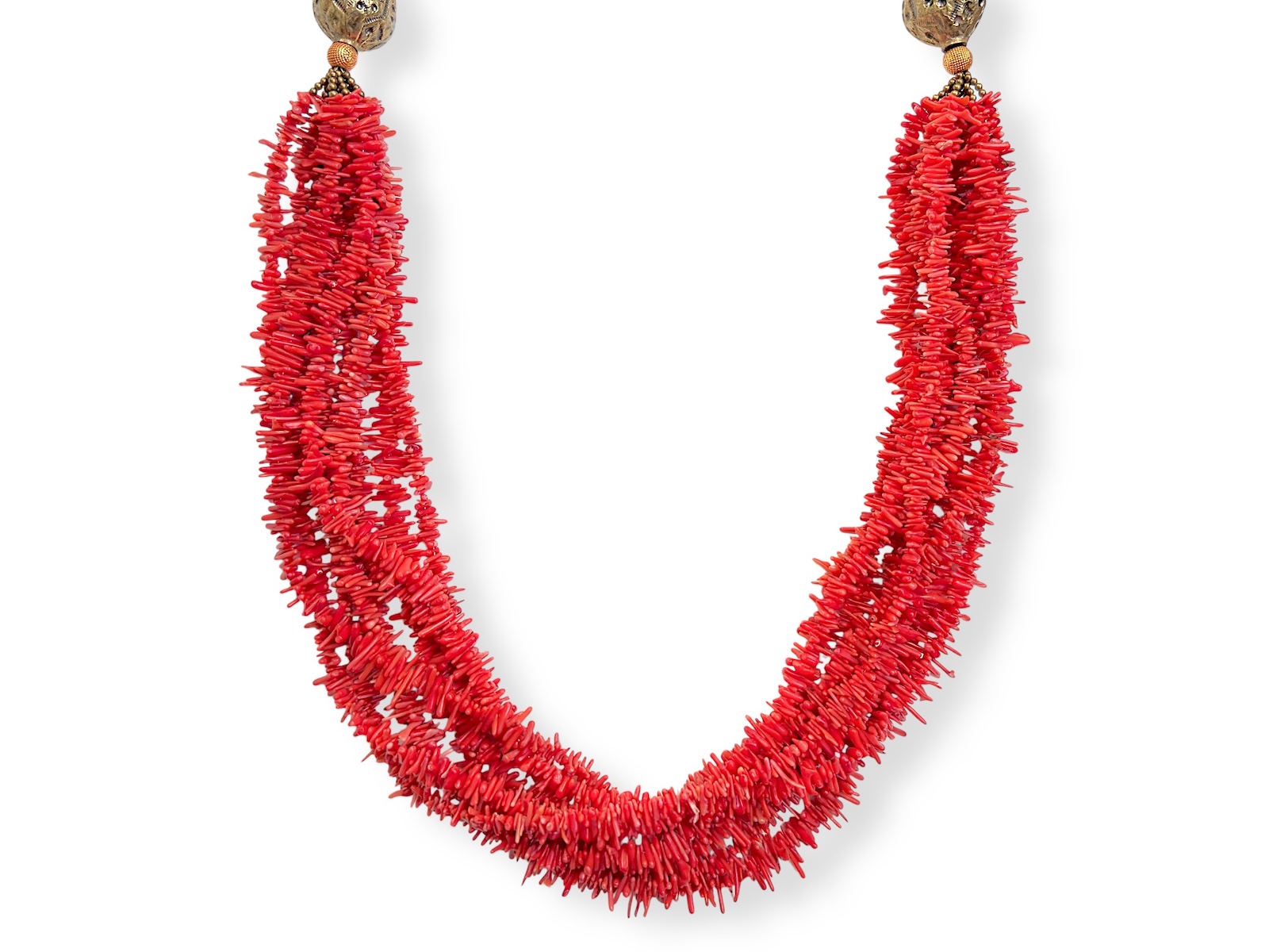 A Nepalese Long Necklace With Strands Of Red Coral Small Branches, Golden Metal Patterned Beads, And Multicoloured Beads.