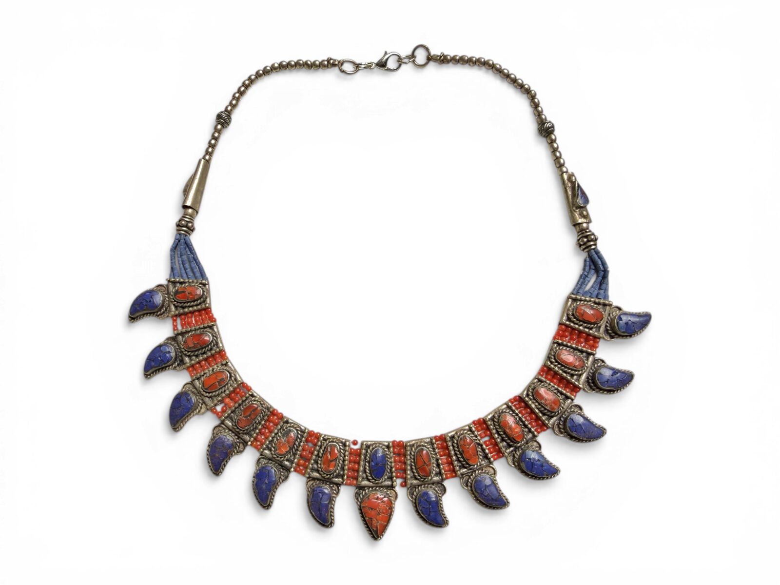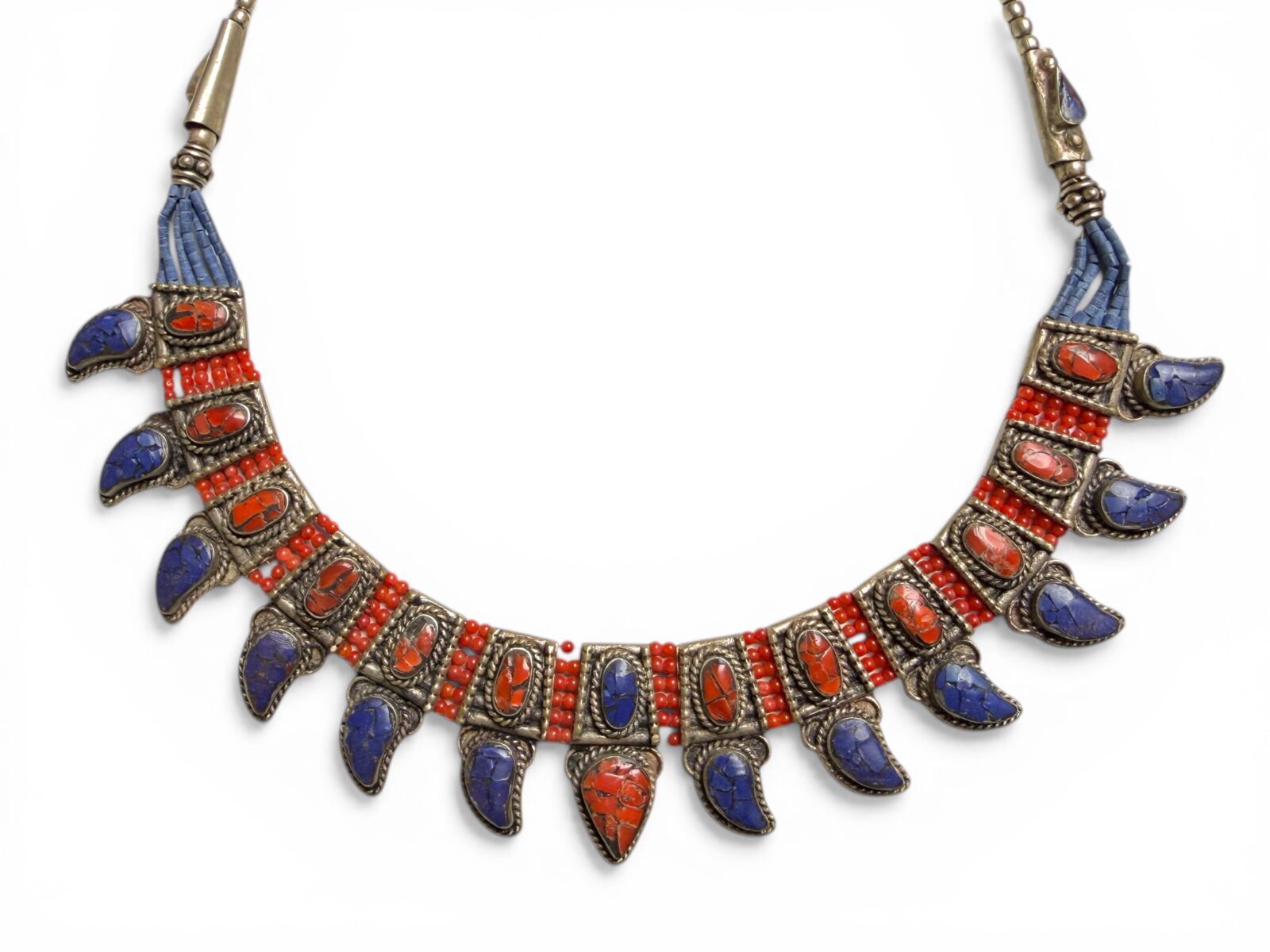 A Nepalese Silver Plated curved six row necklace of lapis tubes and round red coral beads with five thirteen Silver Plated patterned panels of coral chips & lapis inlaid teardrops.