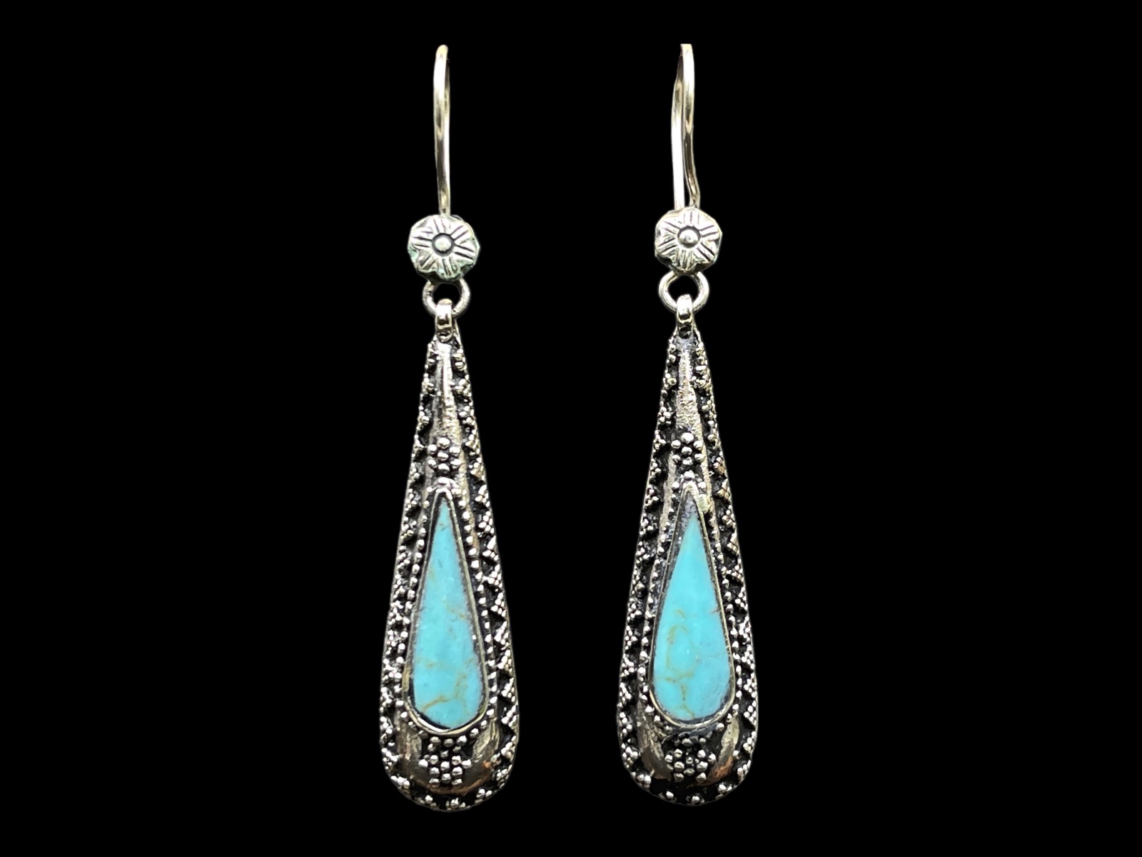 A pair of Afghan Silver Plated long domed patterned teardrop earrings, each inlaid with a light blue dyed Howlite teardrop cabochon, set in a raised Silver Plated bezel. The earrings are bordered with a patterned Silver Plated band, decorated with triangles of small Silver Plated round beads. The earrings are suspended from Silver Plated wire hooks, each decorated with a domed circular patterned flower. The earrings are 1.3 cm in width, 0.8 cm in depth, and, including the wire hook , are 7.3 cm in drop length.