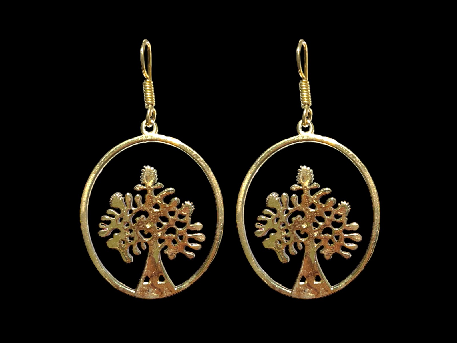 A pair of Balinese Brass oval band earrings, each with a Brass tree in the centre. The earrings are suspended from Brass Wire hooks. The earrings are 3.2 cm in width, and, including the hook, are 5.8 cm in drop length.