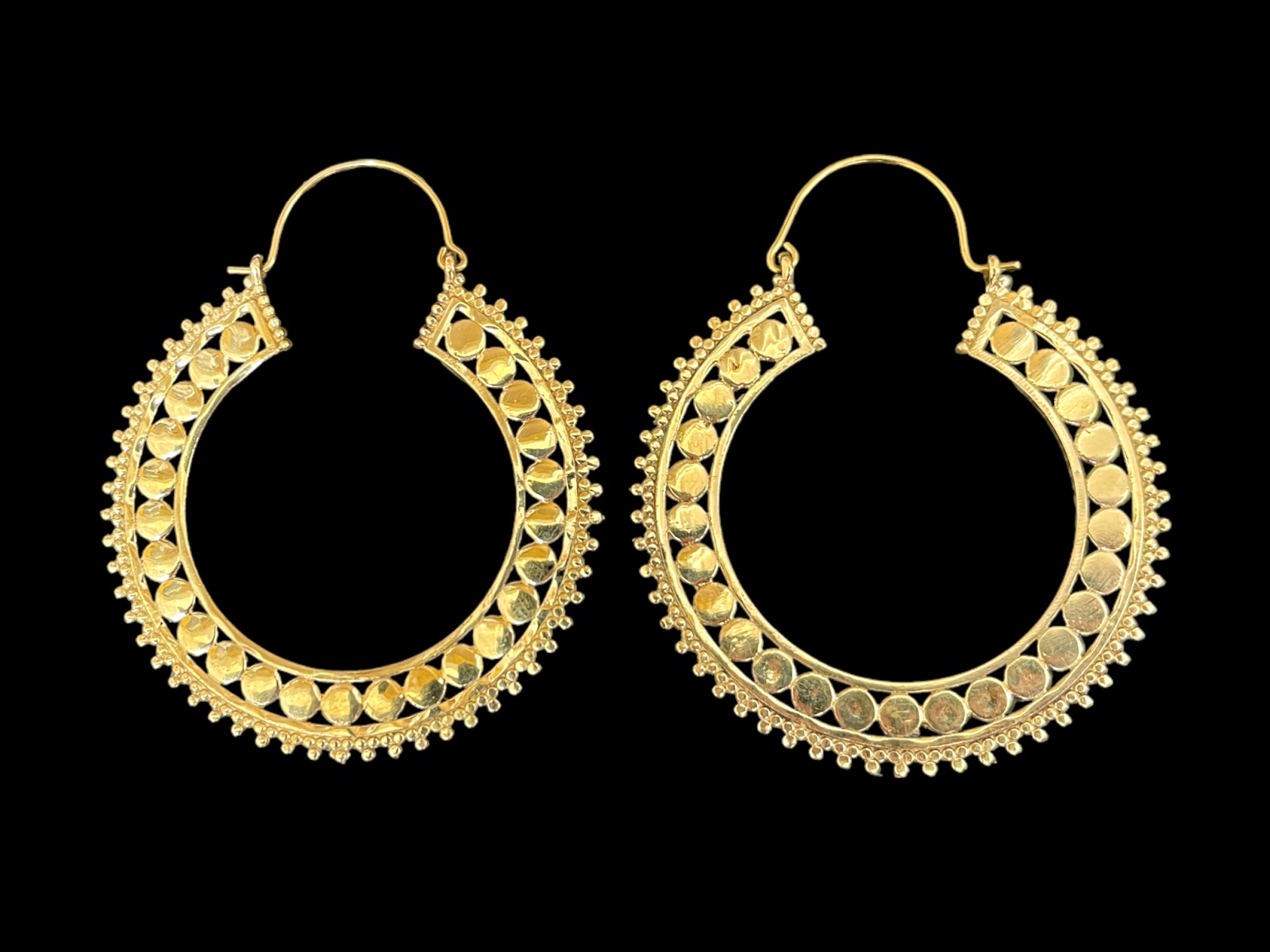 A pair of Balinese Brass earrings, each with a large wide circular open band. The band is decorated with a line of Brass discs and bordered with a line of small triangular panels , each of three very small Brass discs. The earrings are attached by a Brass curved wire band and ring. The inner diameter of each earring is 4 cm, and the outer diameter is 6 cm. The earrings are 7 cm in drop length.