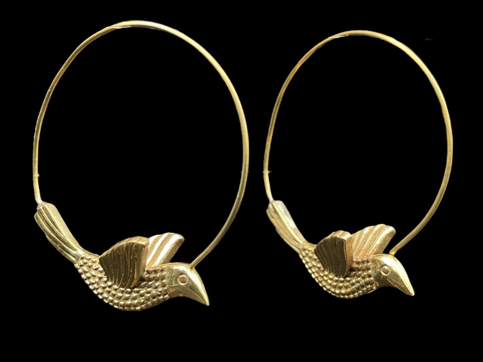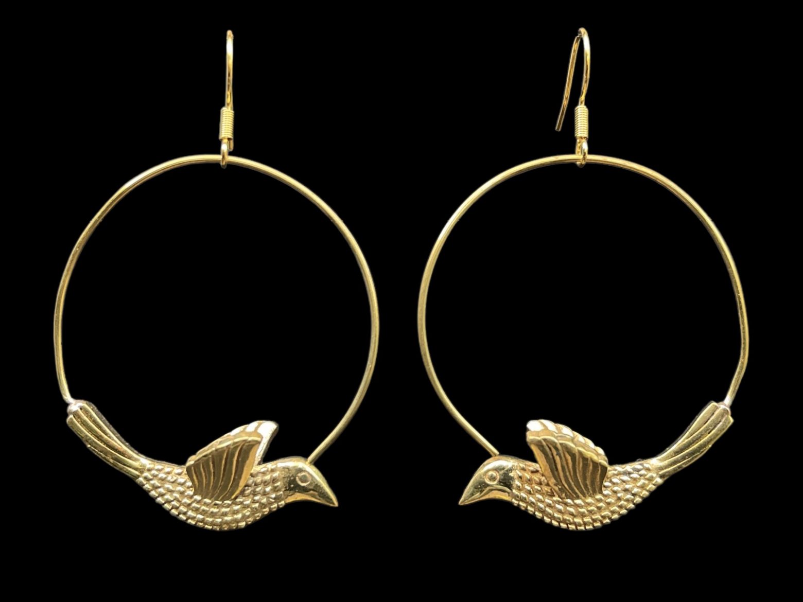 A pair of Balinese Brass circular hoop earrings with central brass birds in flight with wings spread open