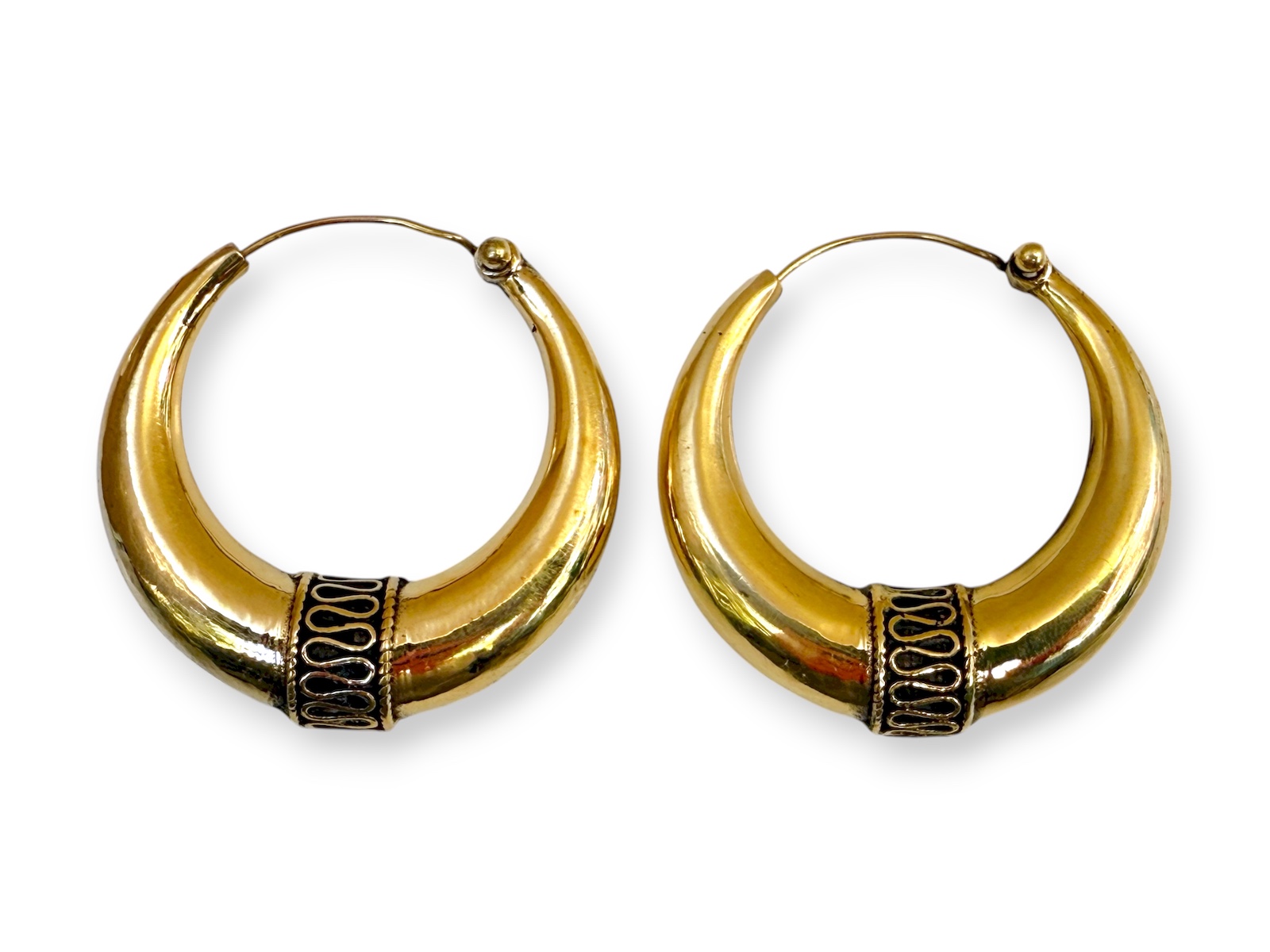 A Pair Of Balinese Brass Medium Hollow Tapered Hoop Earrings, With A Panel At The Base, Decorated With A Coiled Brass Wire Band.