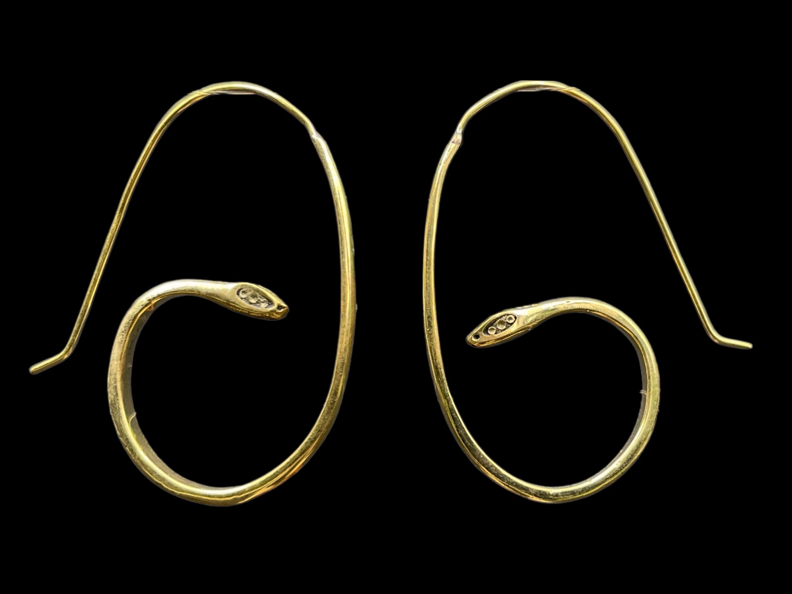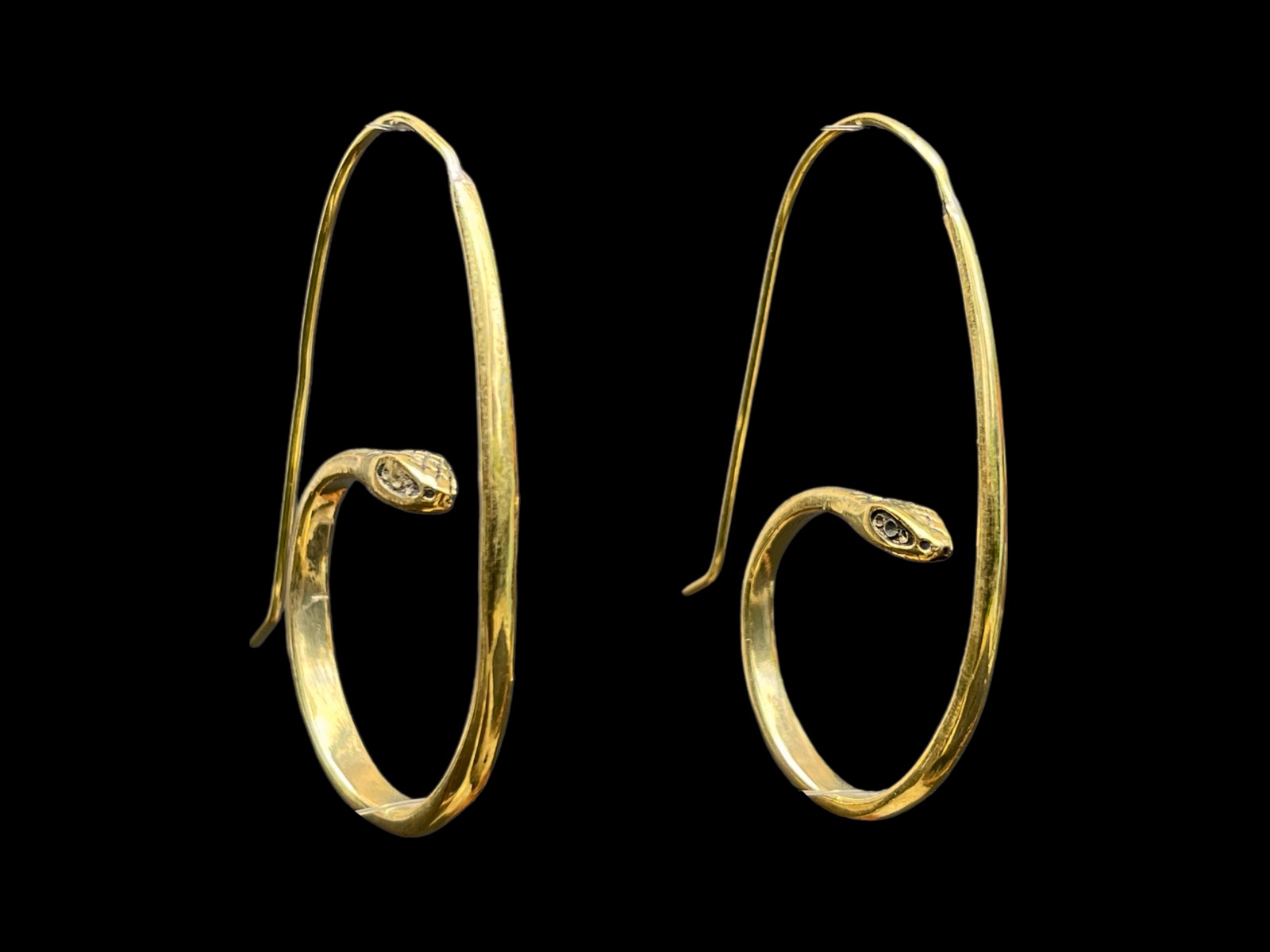 A pair of Balinese brass oval band hoop earrings of a coiled snake. The earrings are 3.9 cm in width, 0.4 cm in depth, and 4.9 cm in drop length.