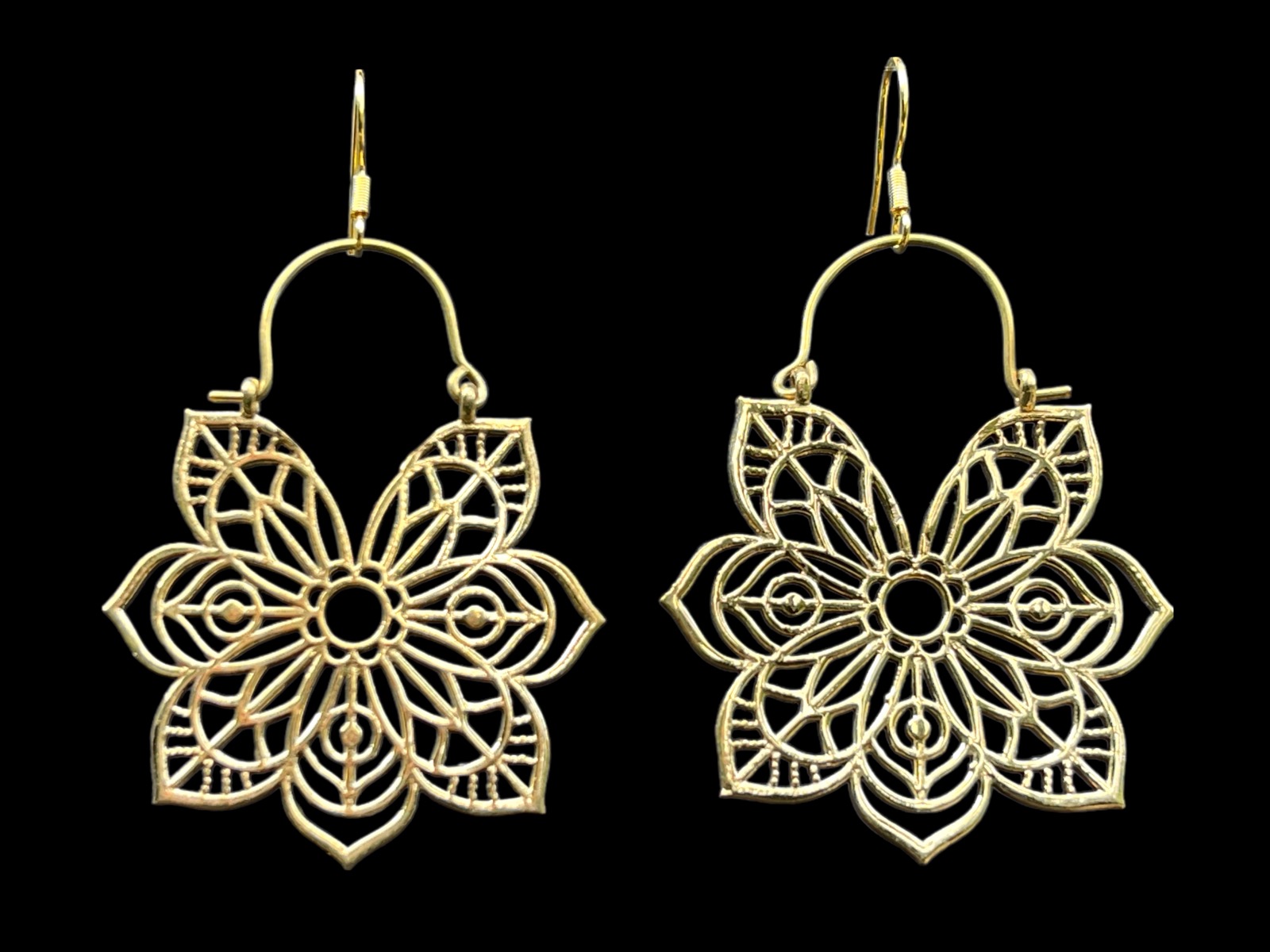 A Pair of Balinese large filigree floral patterned Brass earrings. The earrings are suspended from a curved Brass band, and a Gold Plated wire hook. The hook can be removed and the earrings can be worn as a simple hoop. The earrings are 4 cm in width, 0.2 cm in depth, and, including the Gold Pated wire hook, are 6.7 cm in drop length. Without the wire hook, the earrings are 5 cm in drop length.