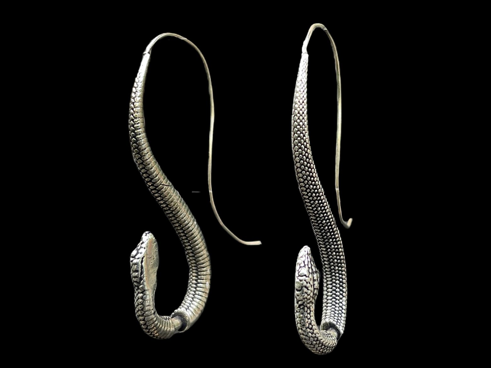 A pair of Balinese silver plated earrings with curved ‘S’ shaped patterned snakes on long silver plated wire hooks.