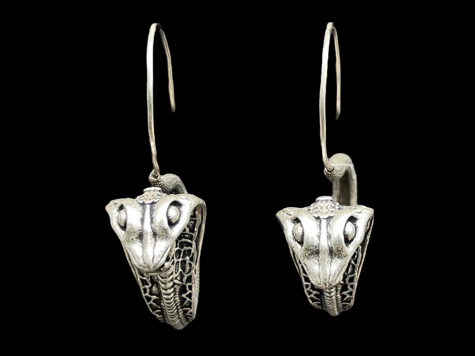 A pair of Balinese silvered metal earrings, each of a patterned Cobra snake on a Silvered Metal curved band.