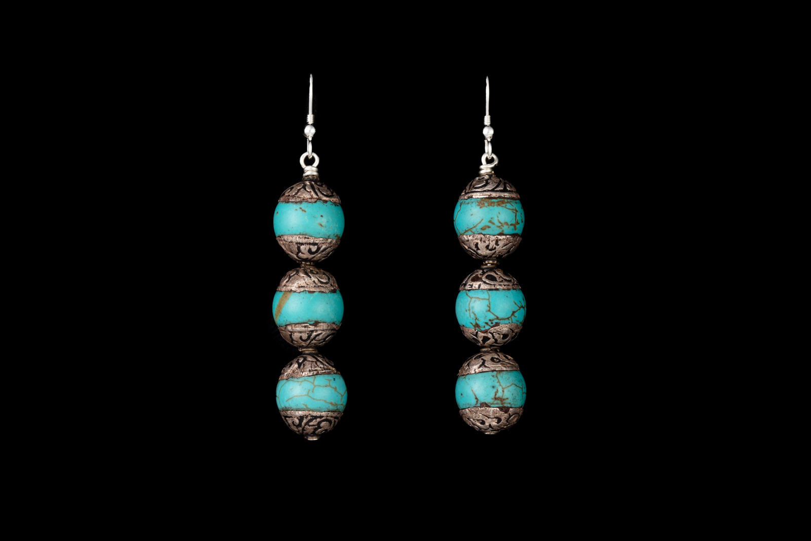 A pair of drop earrings, each of three Afghan oval Turquoise beads with floral patterned Silver borders. Each bead is 0.4 inches in diameter and 0.5 inches in length. The earrings are 2.3 inches in drop length, and are suspended from Silver Plated wire hooks.