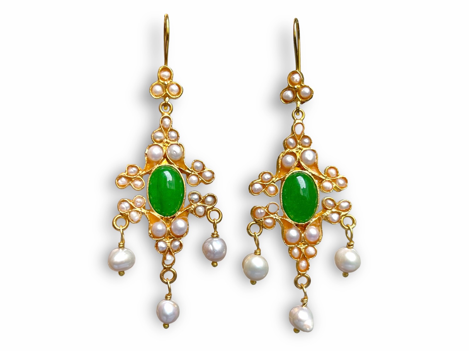 A pair of Gold Plated chandelier drop earrings, each inlaid with a Green Onyx domed oval centre, and groups of small white Freshwater Pearl inlays. Suspended from each earring are three Gold Plated chains with a white Freshwater Pearl at the base. The earrings are suspended from Gold Plated wire hooks, each inlaid with three small white Freshwater Pearls. The earrings are 2.5 cm in width, 0.3 cm in depth, and, including the wire hook, 8.5 cm in drop length.