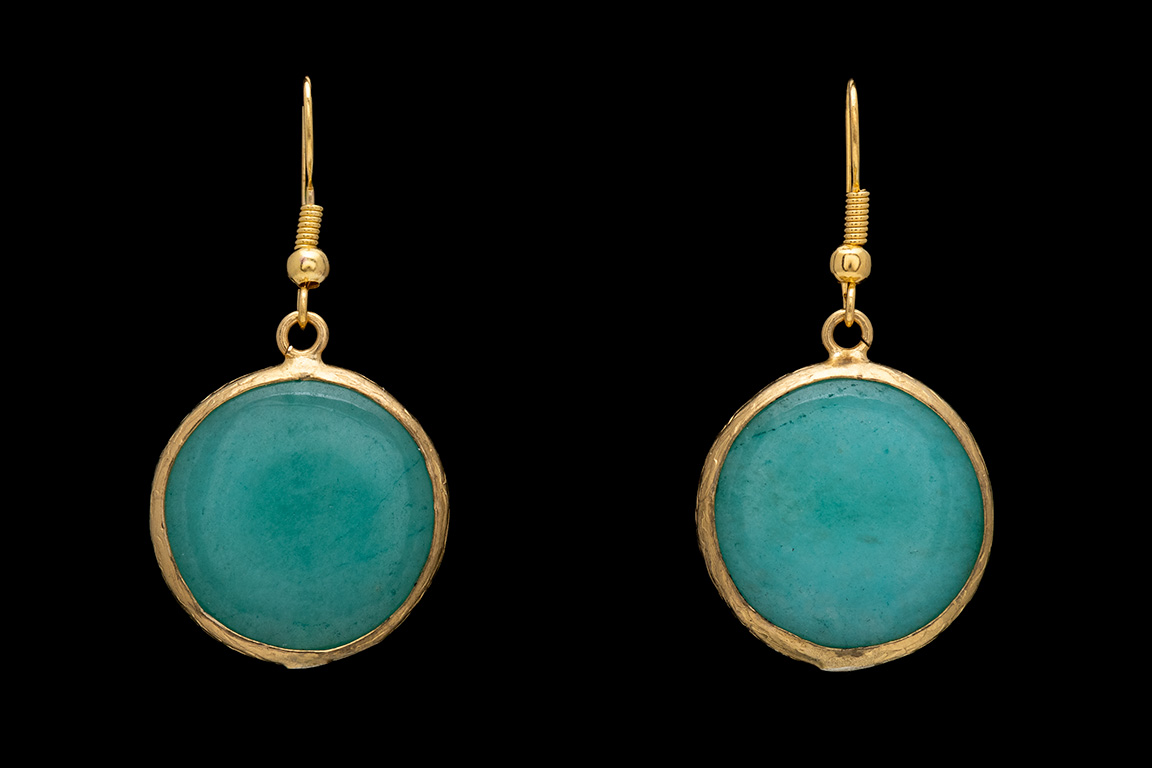 Pair of Gold Plated circular drop earrings, each inlaid with a turquoise dyed domed circular Agate, set in a Gold Plated frame. The circular earrings are 0.6 inches in diameter, 0.2 inches in depth, and have a drop length of 1.5 inches. The earrings are suspended from Gold Plated patterned wire hooks