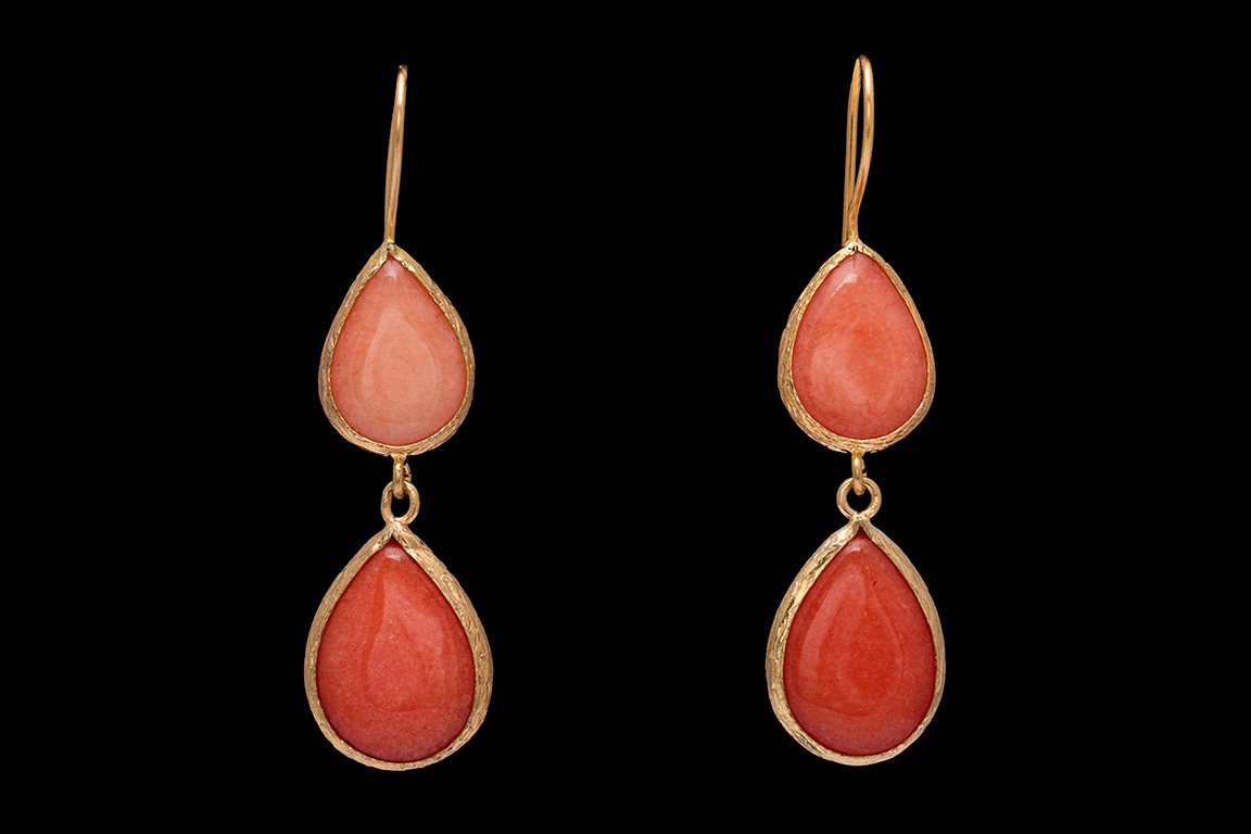 A pair of Gold Plated two linked teardrops earrings. Each earring is inlaid with two orange dyed Agate teardrop shaped cabochons, each set in a Gold Plated frame. The earrings are 0.5inches in width, 0.2 inches in depth, and 2.3 inches in drop length. The earrings are suspended from Gold Plated wire hooks.