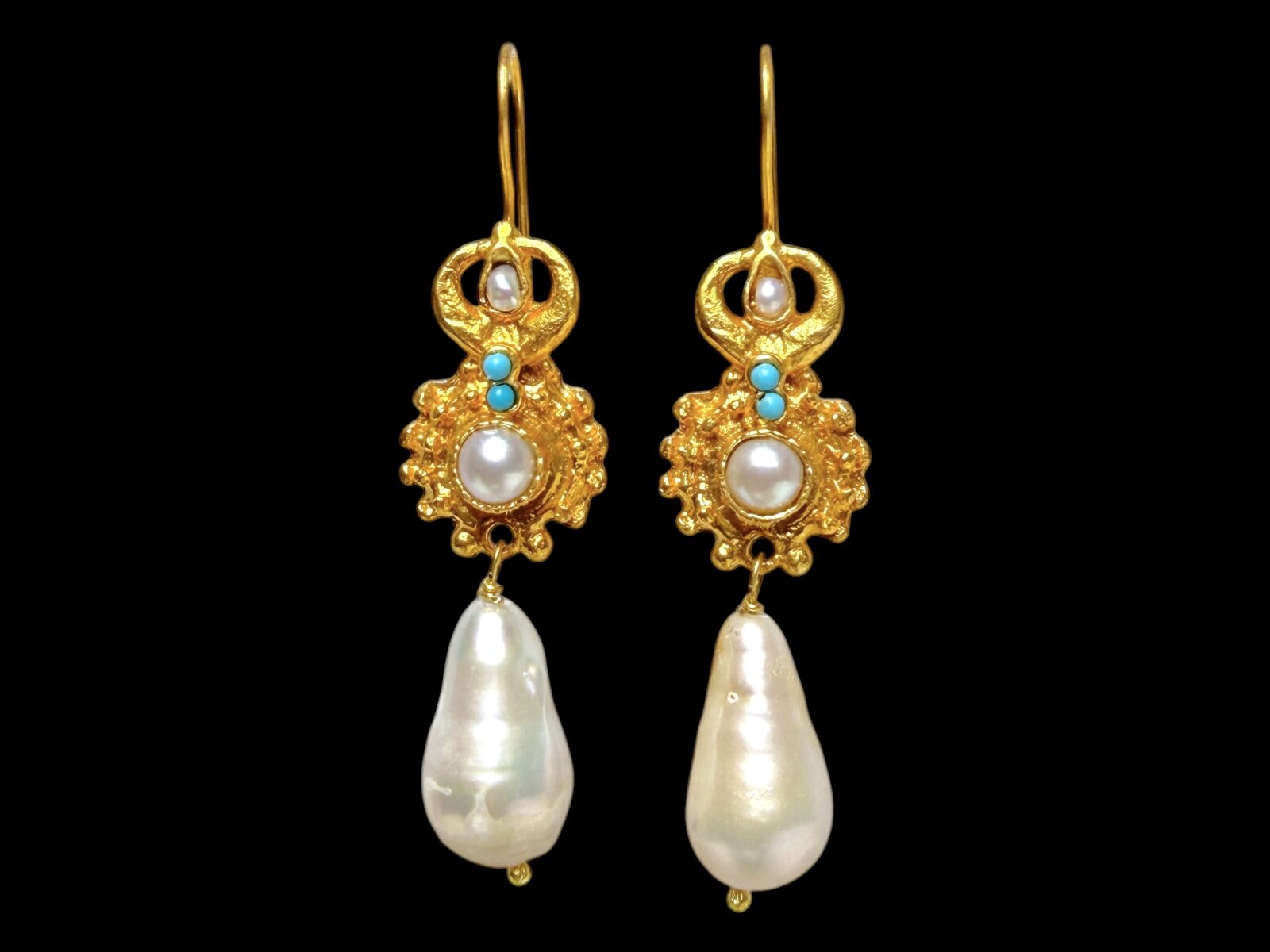A Pair Of Gold Plated Drop Earrings, With A White Baroque Freshwater Pearl Pendant, Two White Freshwater Pearls, And Two Turquoise Round Beads.