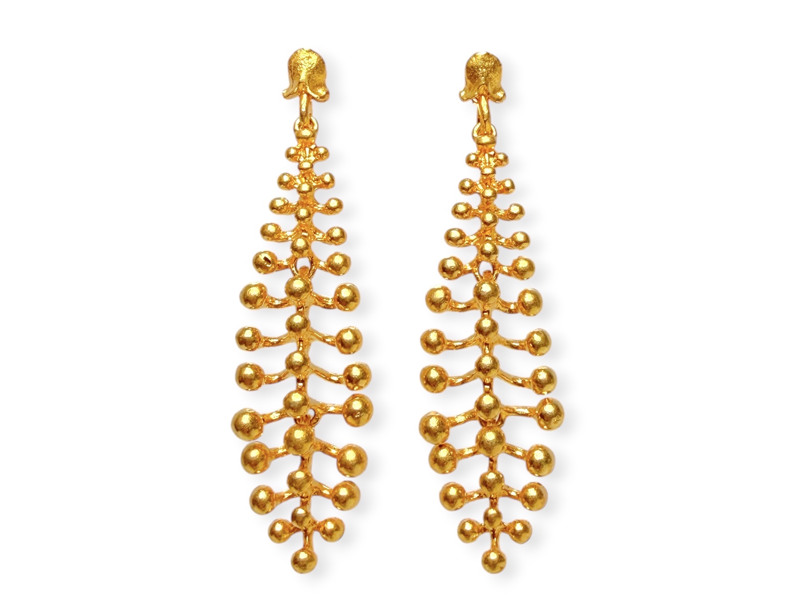A pair of Gold Plated, fish shaped, long drop earrings of three different length linked panels, each panel decorated with three rows of small domed circular beads set at the end of small curved bands. The earrings are suspended from a Gold Plated post and cover, set at the back of a small Gold Plated patterned panel. Each earring is 1.6 cm in width, 0.5 cm in depth, and 7 cm in drop length.