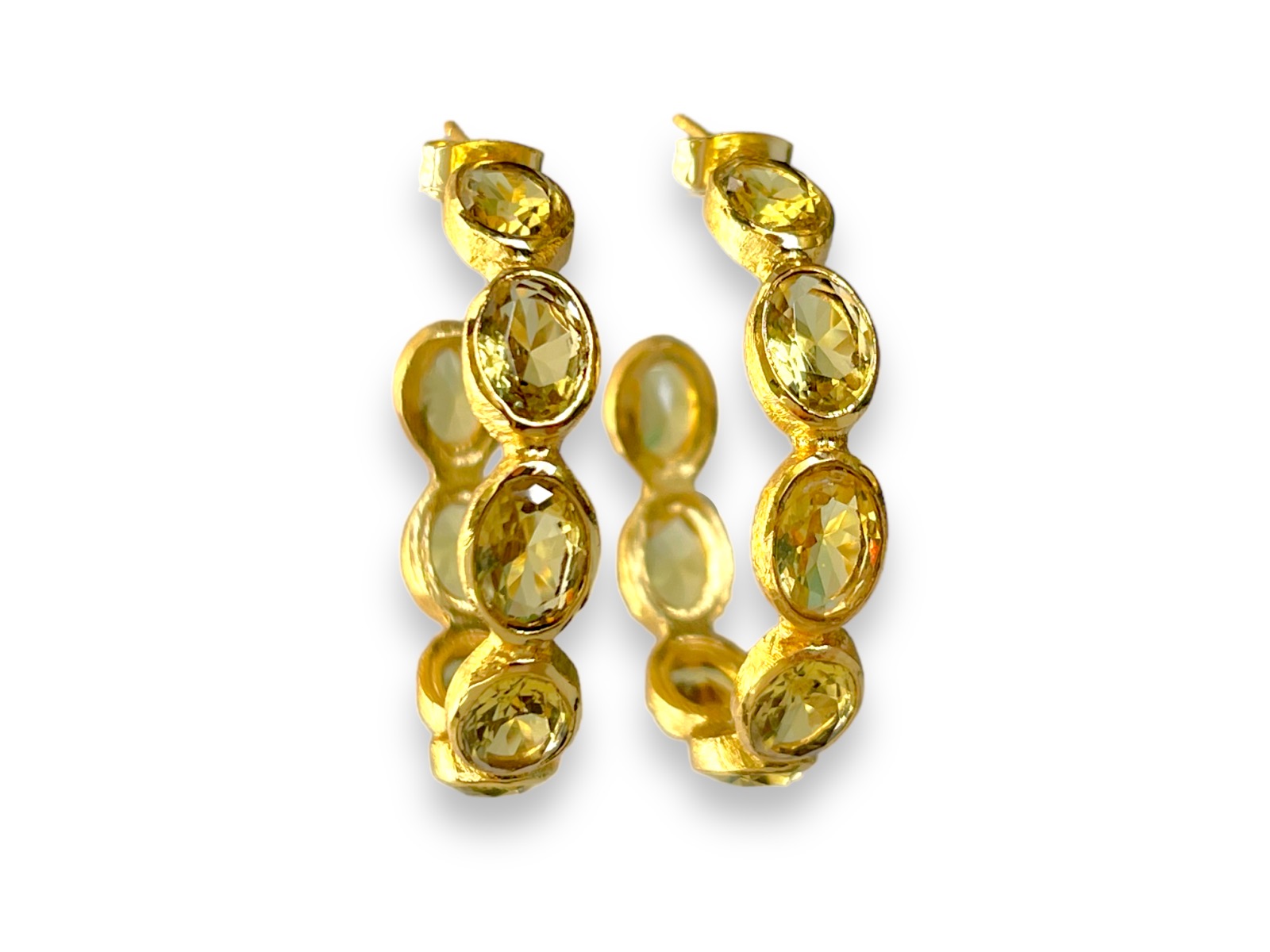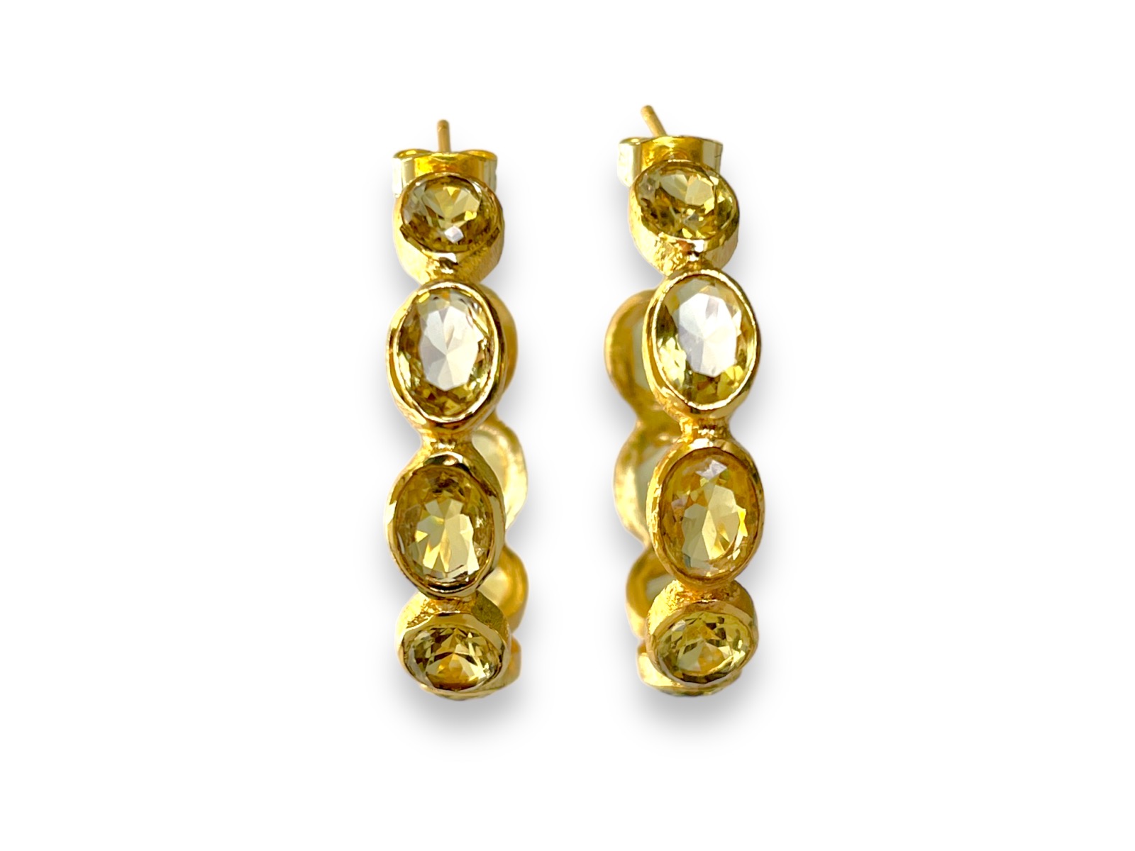 A pair ofd Gold Plated semi-circular open band earrings decorated with seven Gold Plated oval cases, each inlaid with a golden yellow facetted Glass domed oval bead. The earrings are attached by a Gold Plated wire post and a butterfly holder.