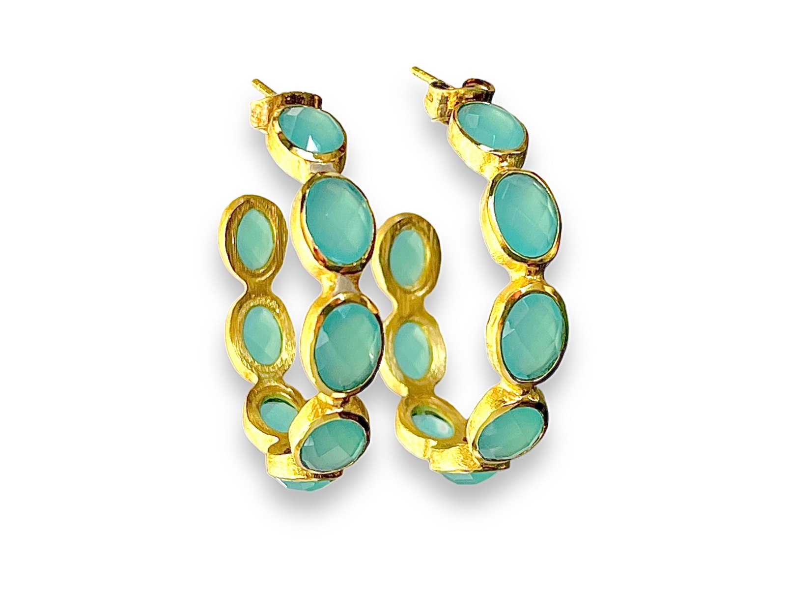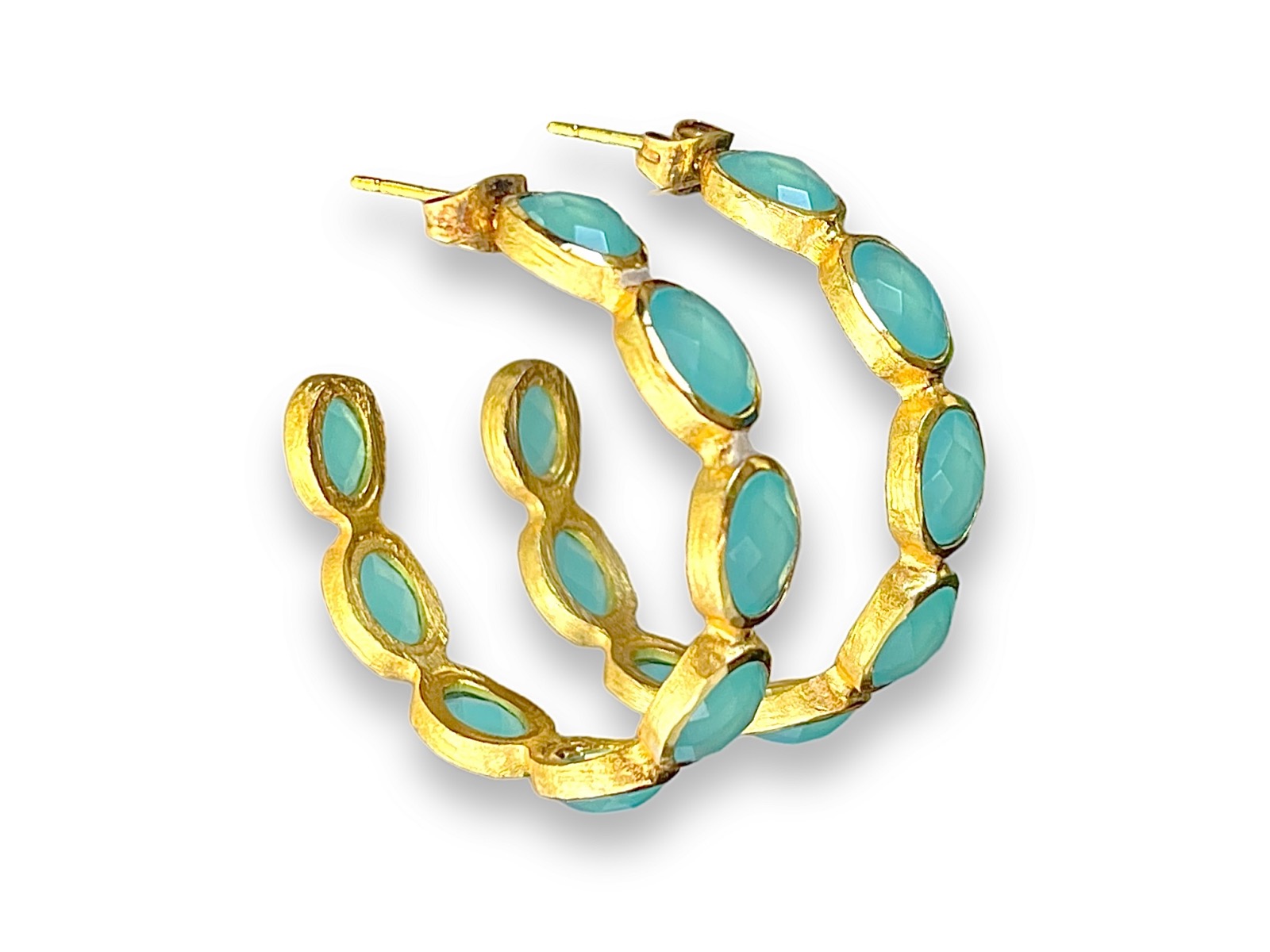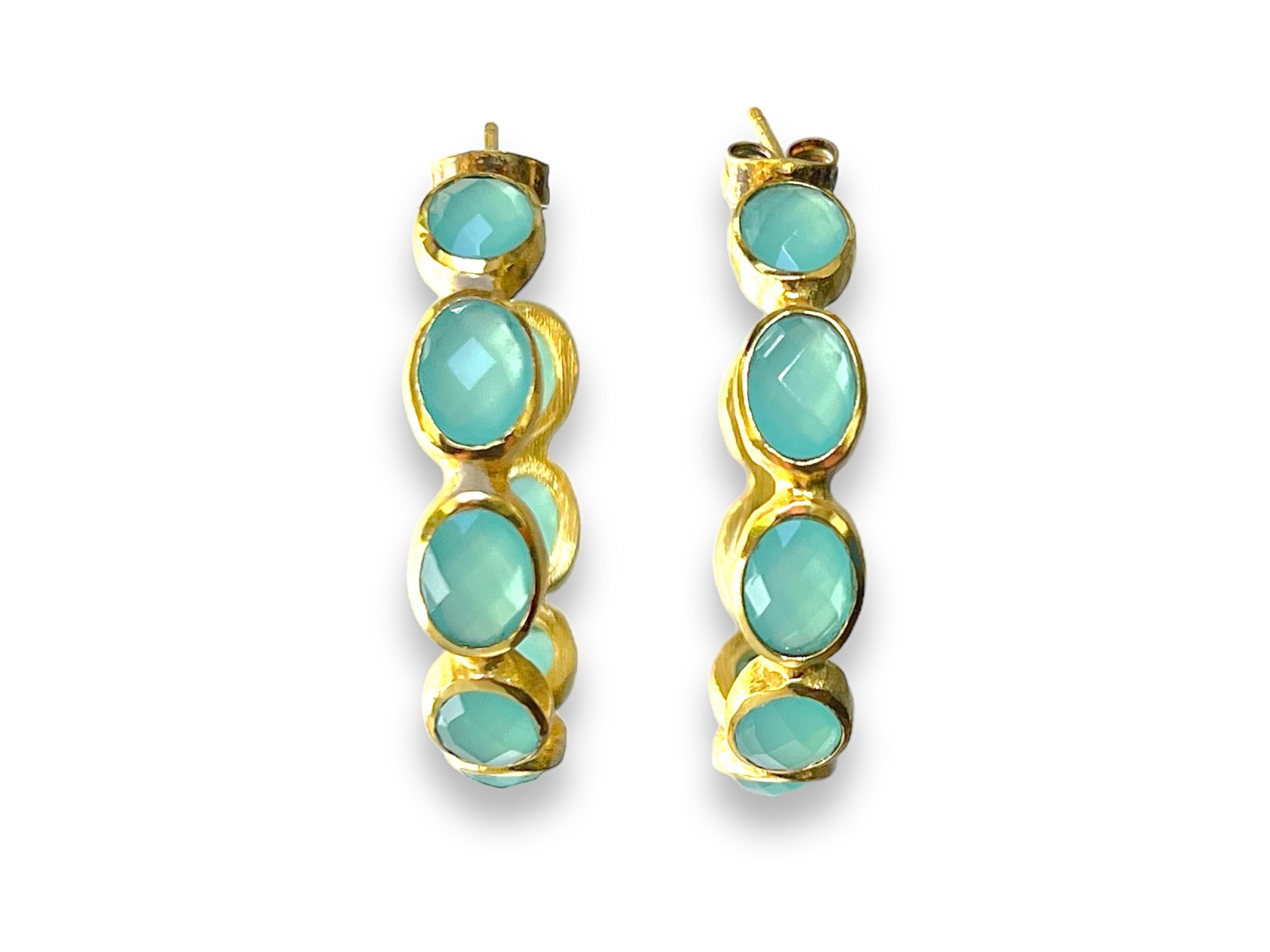 A pair of Gold Plated semi-circular open band earrings decorated with seven Gold Plated oval cases, each inlaid with a pale blue facetted Glass domed oval bead. The earrings are attached by a Gold Plated wire post and a butterfly holder.