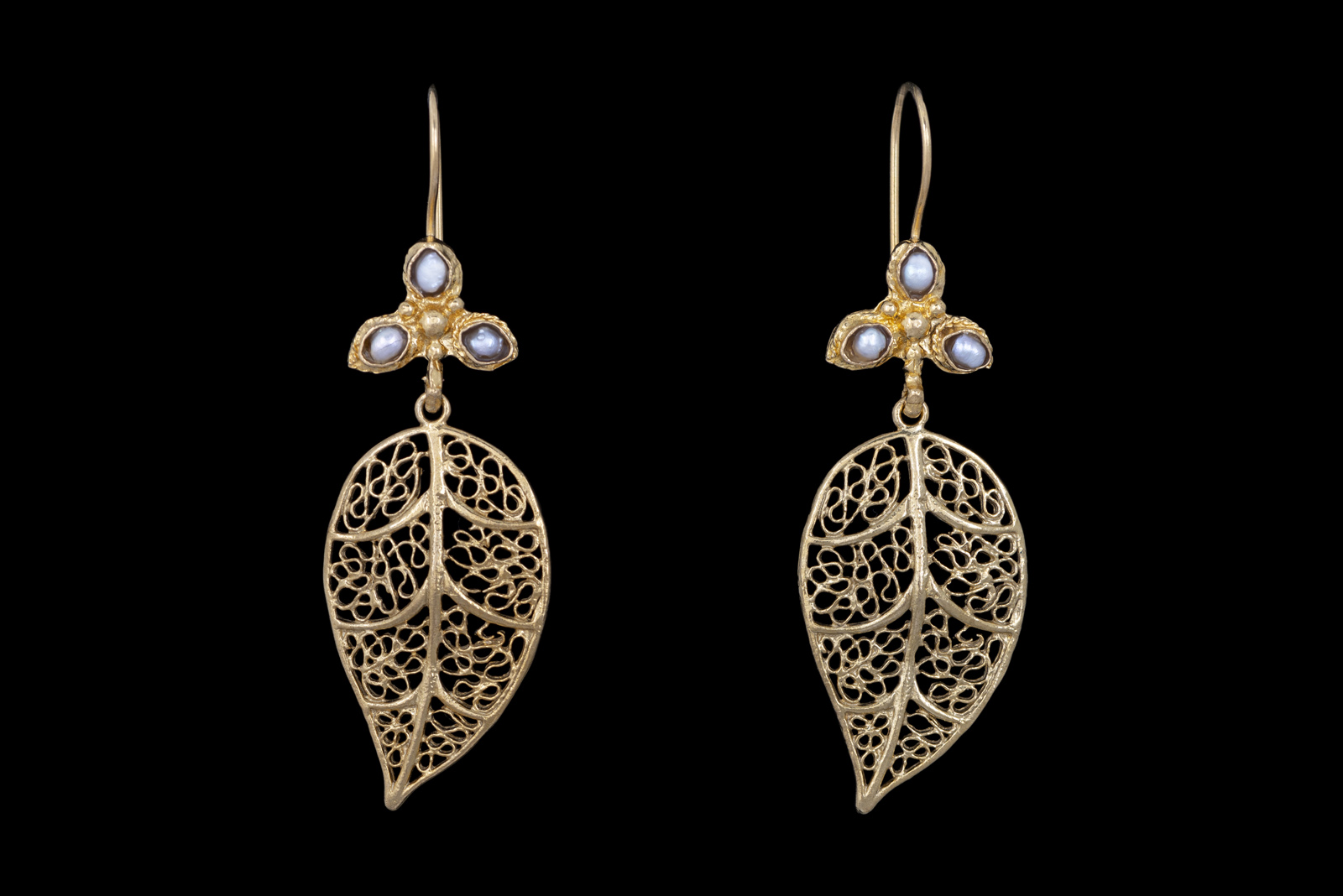 A pair of Gold Plated skeleton leaf drop earrings suspended from Gold Plated wire hooks,, each inlaid with three small white Freshwater Pearls. The earrings are 0.7 inches in width and are 2.5 inches in drop length.