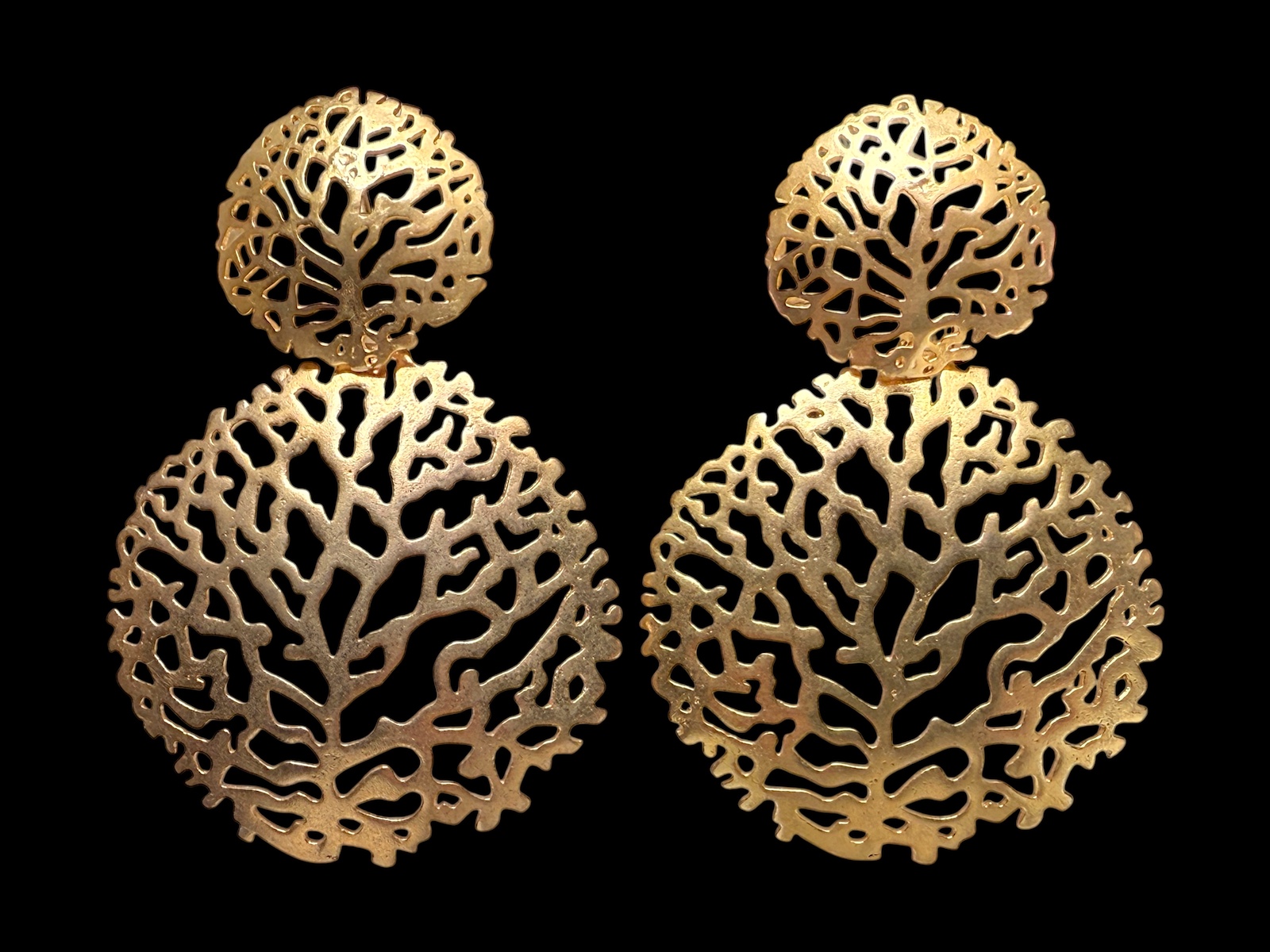 A pair of Golden Metal, (Nickel free), earrings, each with a large and a small, linked, domed circular, filigree patterned, ‘coral’ drop. The large drop is 4.5 cm in diameter and the small drop is 2.5 cm in diameter. The drop length of each earring is 6.5 cm, and the earrings are attached, by a Golden Metal, (Nickel free), post and cover, at the back of the small domed circular drop.