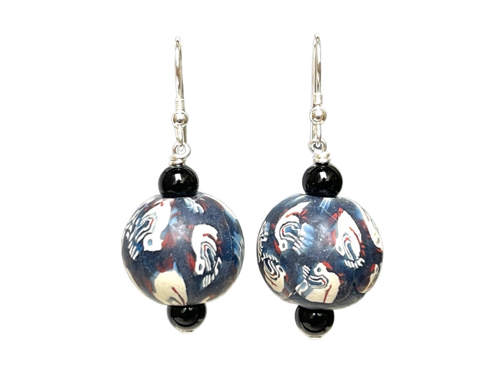 A Pair Of Javanese blue, white and red, bird patterned ,Glass bead earrings. At the top and base of each earring, is a small Black Onyx round bead. The earrings are suspended from Silver wire hooks.