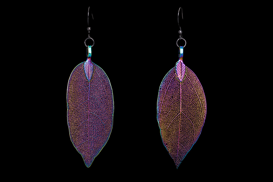 A pair of pink, gold, and blue, electro-formed skeleton leaf drop earrings. The earrings are 1 inch in width, and have a drop length of 3.4 inches. The earrings are suspended from Gunmetal, (Nickel free), wire hooks.