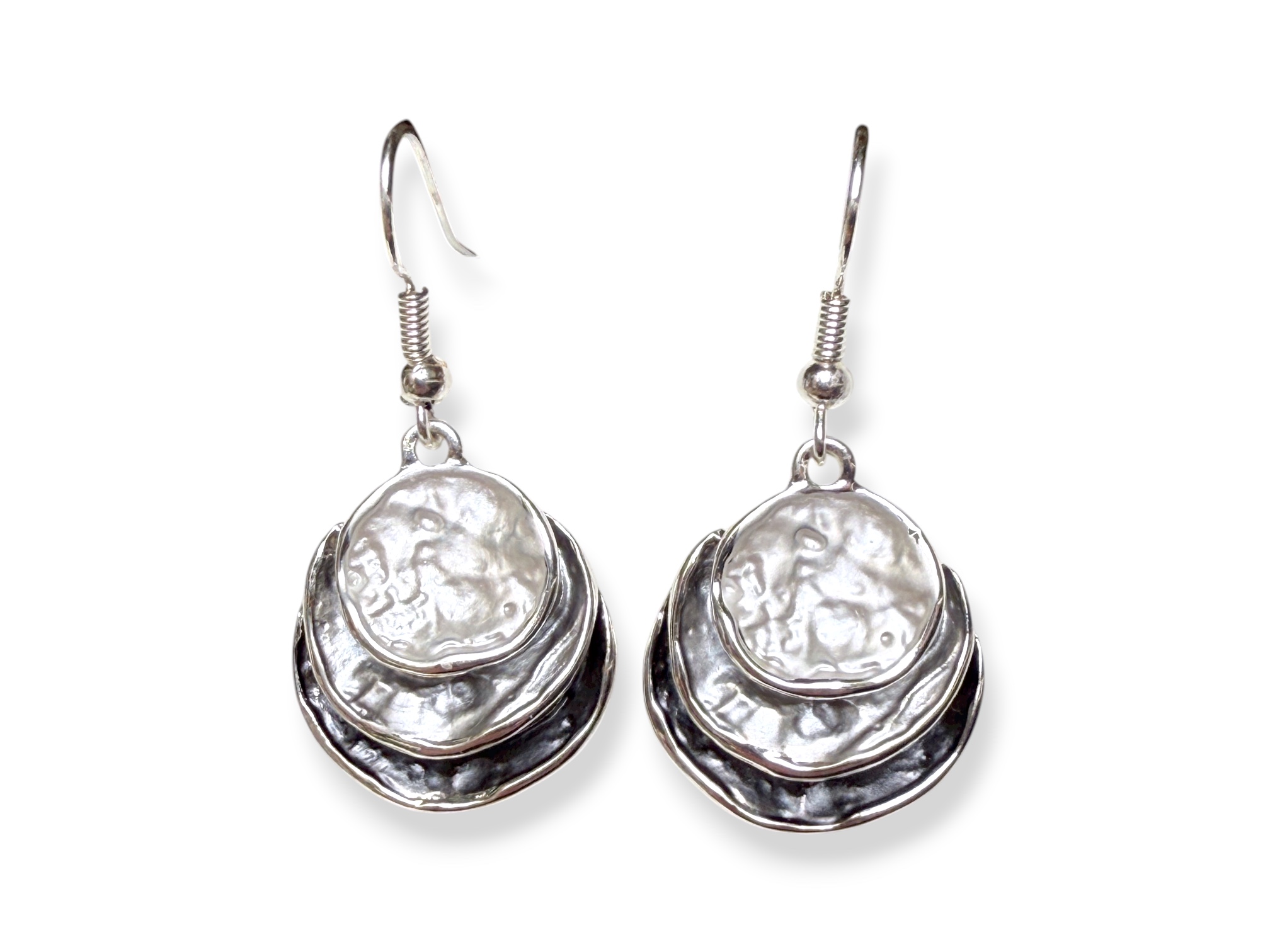 A pair of Silver Plated earrings , of three small overlapping graduated sized, patterned surface discs, each disc with a Silver Plated border. The smallest disc has silvered white enamelling, the second disc has grey enamelling, and the largest disc has black enamelling.The earrings are suspended from Silver Plated wire hooks. The smallest disc is 1 cm in diameter, the largest disc is 4 cm in diameter, and the earrings are 0.3 cm in depth. The drop length of each earring and hook, is 4 cm.