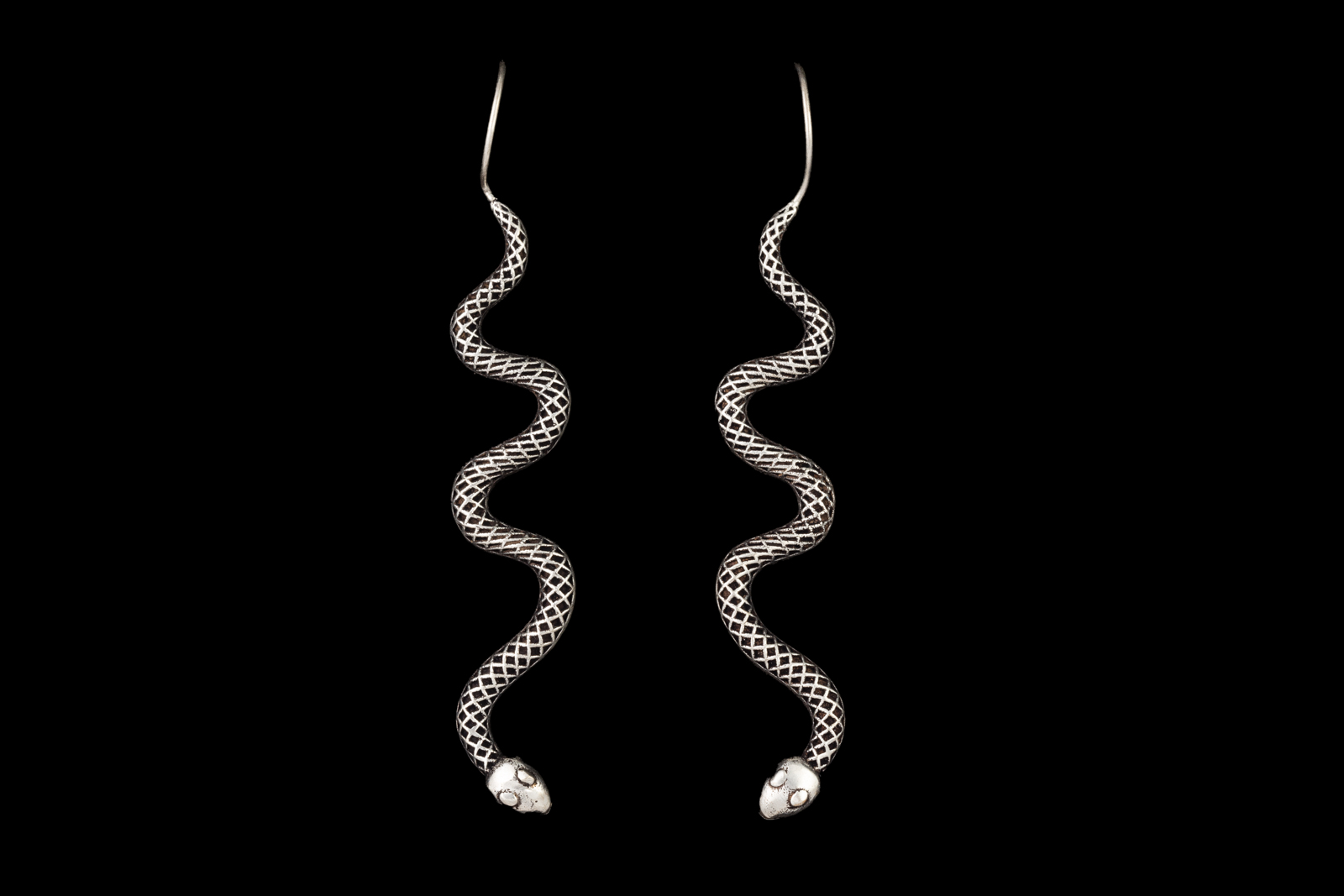 A pair Silver Plated long wavy snake earrings, suspended from Silver Plated wire hooks. The earrings are 3.6 inches in drop length.