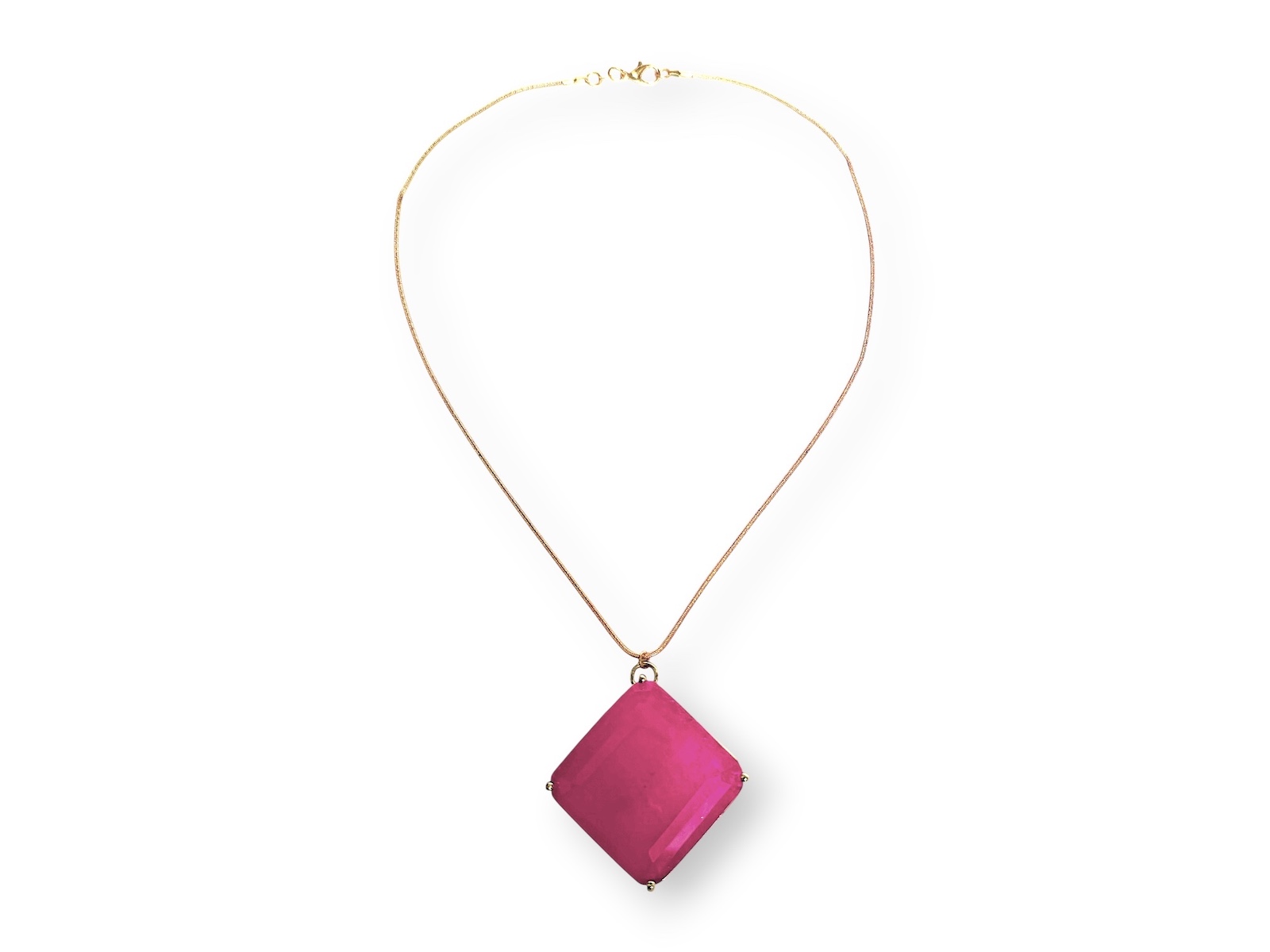 A pink electroplated facetted Rock Crystal, diamond shaped pendant, set in a Gold Plated rectangular bands case, suspended, by a Gold Plated ring, from a Gold Plated chain necklace. The pendant is 4.5 cm in width, 1 cm in depth, and, including the ring, is 5 cm in drop length. The necklace is 46.5 cm in length, and is attached by a Gold Plated oyster clasp and ring.