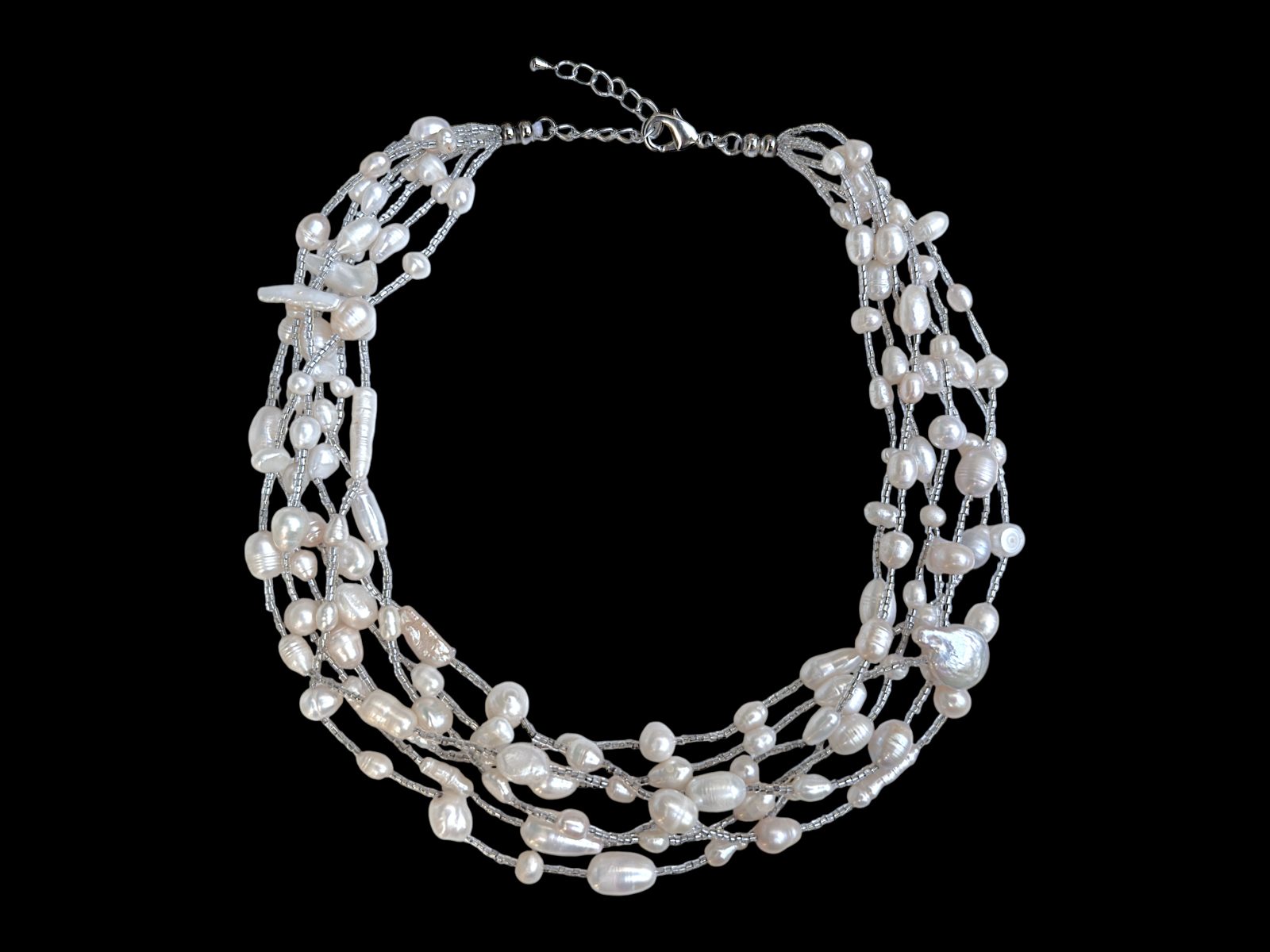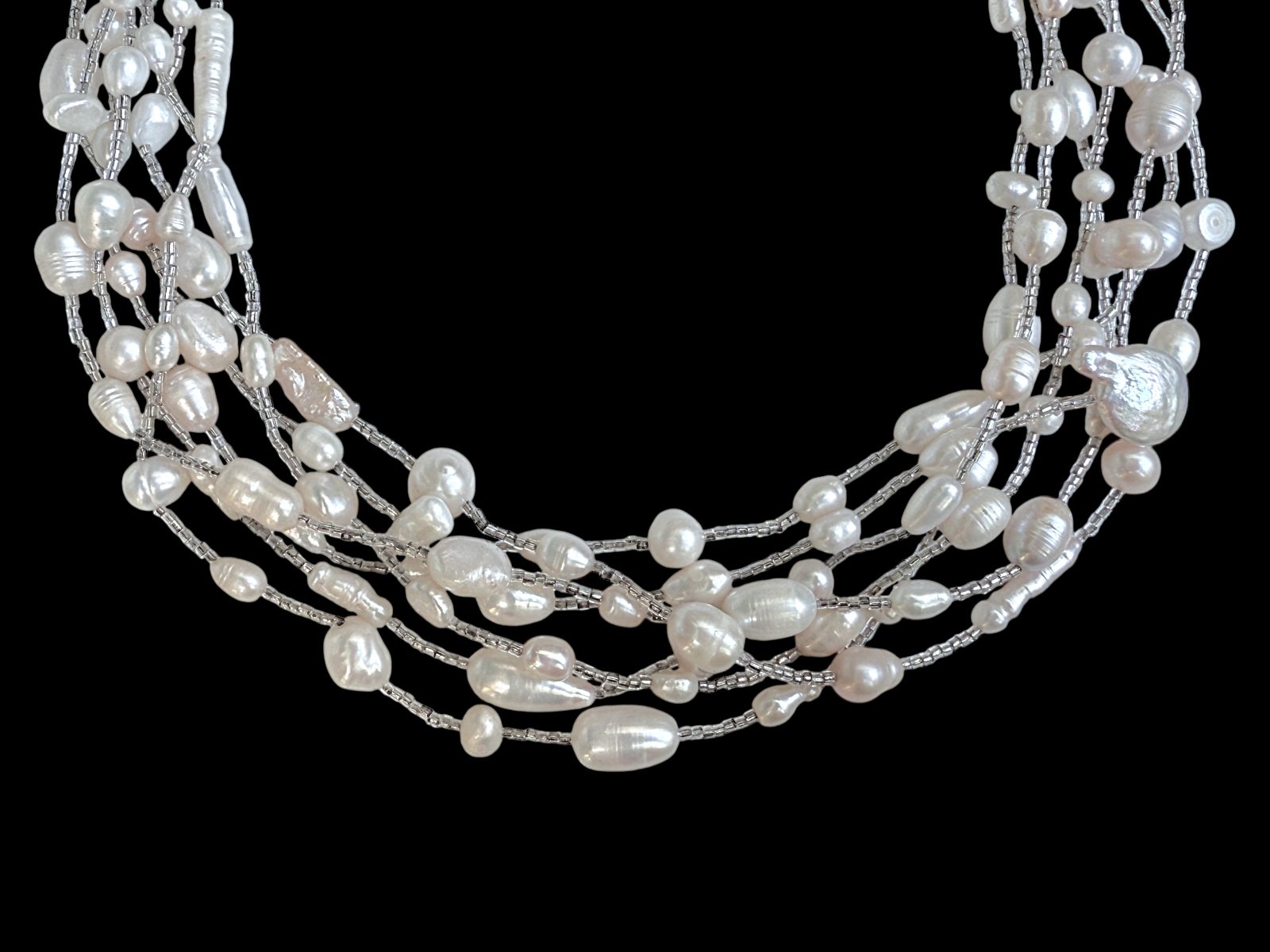A seven strand necklace of white Freshwater Pearls of mixed shapes and sizes, and small clear Glass tubular beads. The length of the necklace is adjustable from 52 cm to 68 cm, and the necklace is attached by a Silver Plated oyster clasp and a 6 cm Silver Plated chain, (for adjustable sizing).