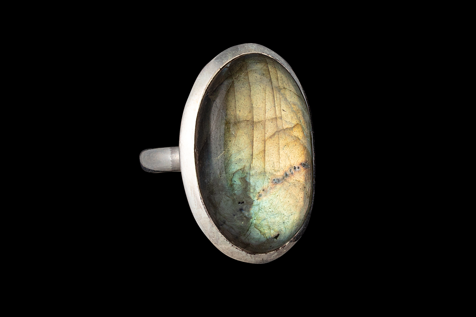A Silver adjustable sized band ring with a Madagascan Labradorite long domed oval bezel set in a Silver frame. The Labradorite cabochon is0.6 inches in width, 1.1 inches in length, and 0.2 inches in height.