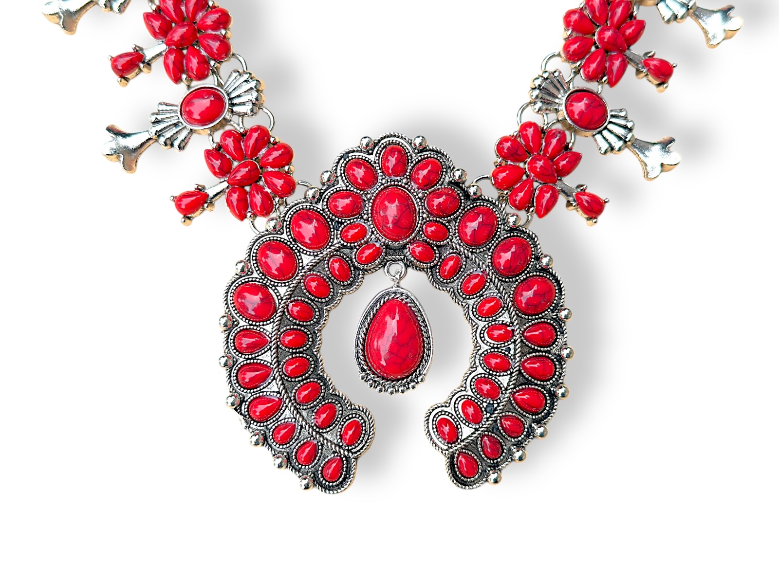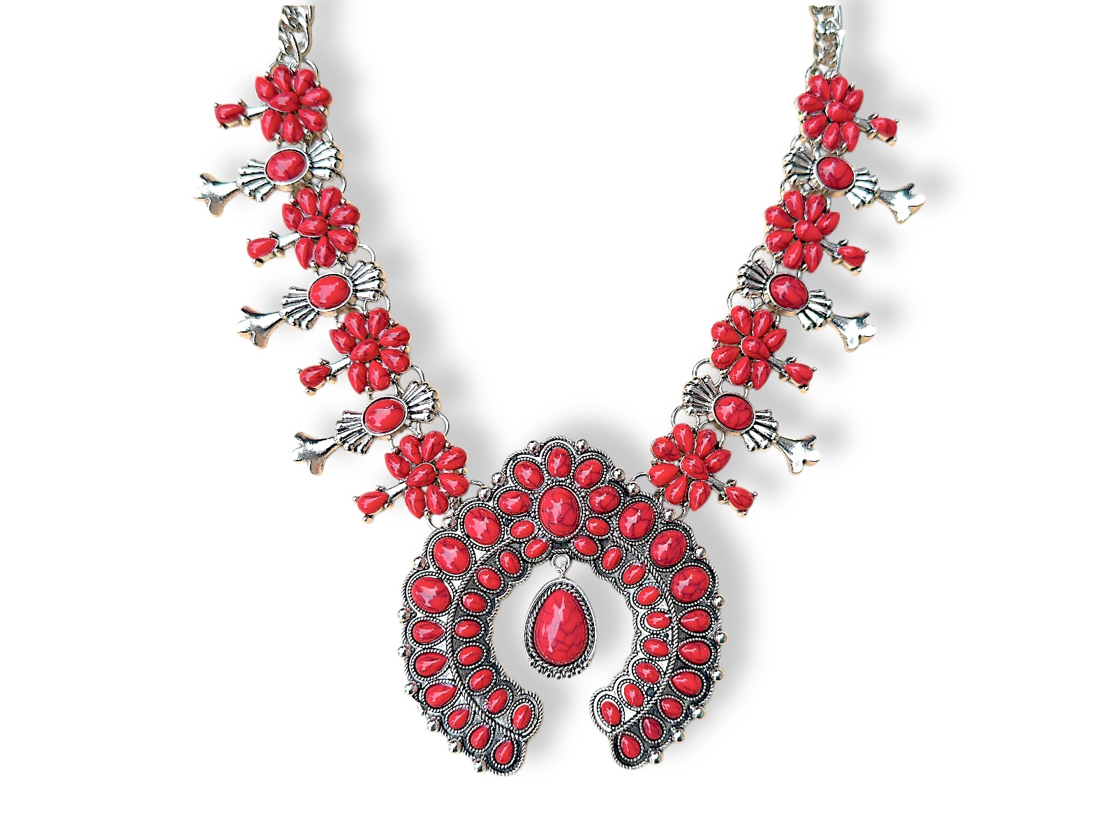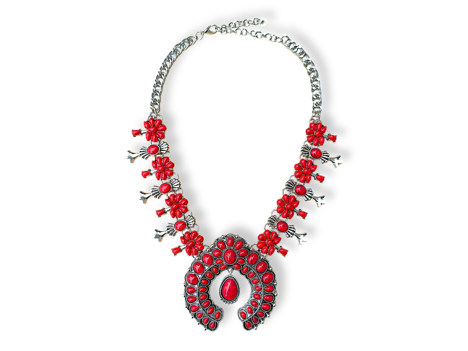 A Silvered Metal, (Nickel free), ‘American Indian’ style chain necklace decorated with eight patterned panels, each inlaid with eight small red dyed Howlite domed teardrop beads, six Silvered Metal patterned panels, each inlaid with one red dyed Howlite domed oval bead, and a large Silvered Metal curved band pendant, inlaid with forty-six, mixed sized, domed oval, and domed teardrop shaped red dyed Howlite beads. Suspended from the centre of the pendant is a Silvered Metal teardrop shaped small pendant, inlaid with a red dyed Howlite, domed teardrop shaped bead. The pendant is 7.5 cm in width, 0.4 cm in depth, and 8 cm in drop length. The drop length of the necklace and pendant is adjustable from 26 cm to 32 cm, and the necklace is attached, at the top, by a Silvered Metal oyster clasp, and a 12 cm chain, (for adjustable sizing).