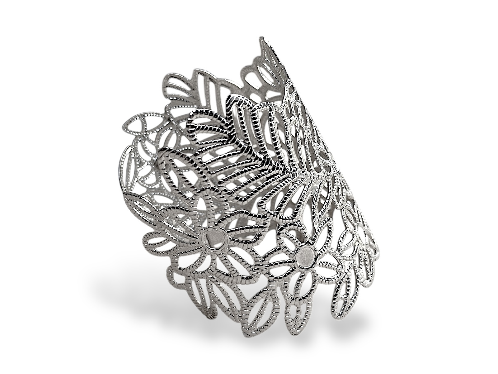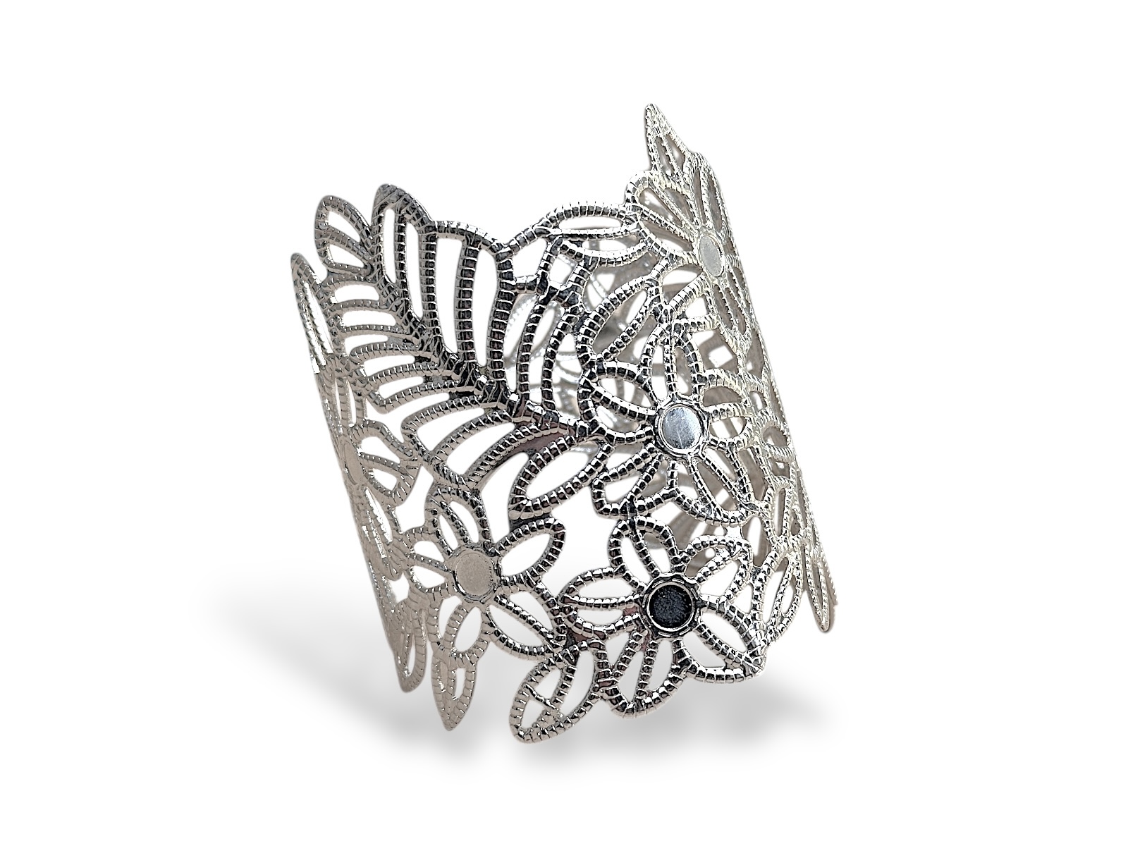 A Silvered Metal, (Nickel free), filigree patterned open cuff of seven flowers and three leaves, each flower with a small mirrored disc inlaid at the centre. The cuff is 7 cm in width, and the inner diameter of the cuff is 5.5 cm, (adjustable).