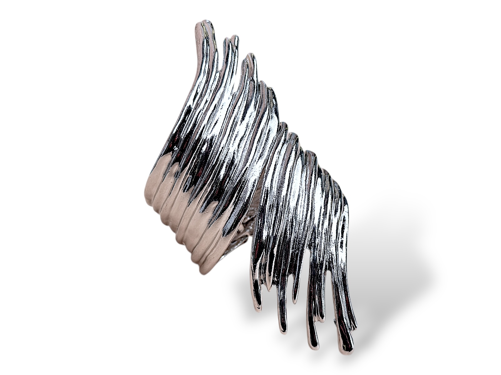 A Silvered Metal, (Nickel free), long hinged bangle of sixteen curved and coiled bands.The bangle is 11.5 cm in length, and the inner diameter of the bangle is 5.5 cm.