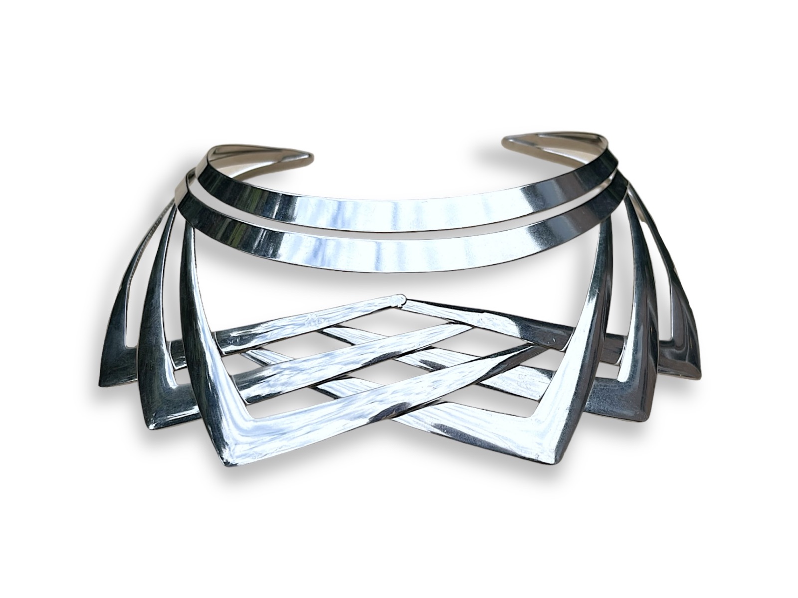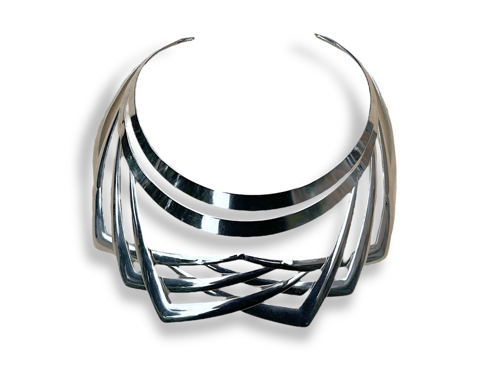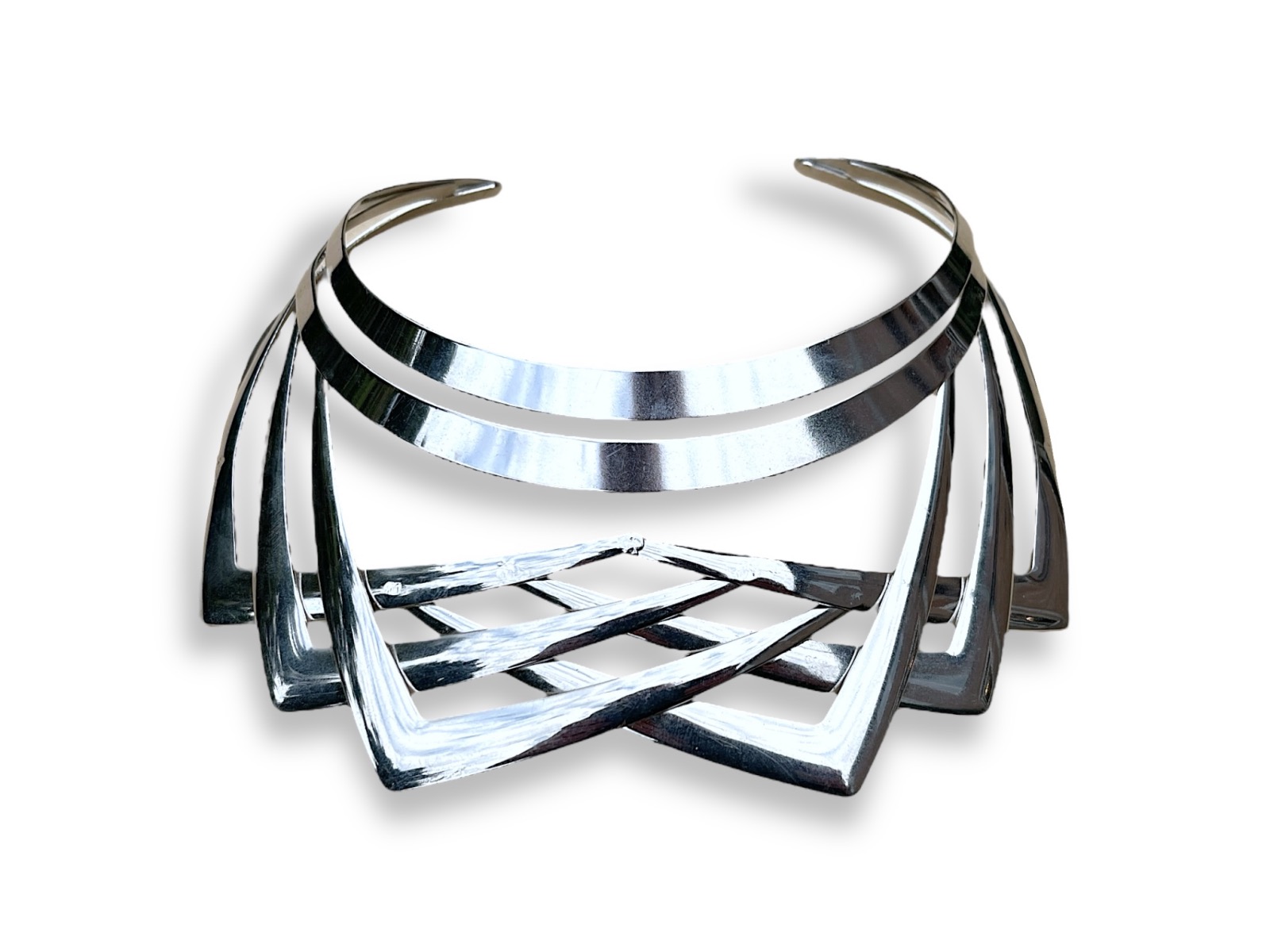 A Silvered Metal, (Nickel free), two curved tapered bands torque necklace with three Silvered Metal interlocking triangular shaped bands. The inner diameter of the necklace is 11.5 cm, and the centre of the front of the necklace is 7.5 cm in drop length.
