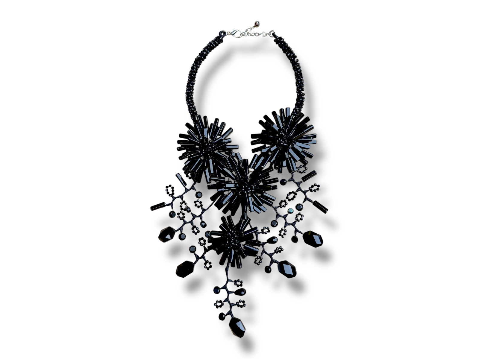 A Thai large curved bands necklace, with four large flowers, each of long black facetted rectangular Glass beads, and, in the centre of each flower, bunches of small round black facetted Glass beads. There are six black Silk covered branches with leaves, each leaf of mixed sized black facetted Glass beads. The three largest flowers are 8.5 cm in diameter and 1.5 cm in depth. The inner diameter of the bands of the necklace, is 15 cm, (adjustable). The necklace is 19 cm in width, 2 cm in maximum depth, and the drop length is adjustable from 40 cm to 43 cm in drop length. The necklace is attached, at the top, by a Silver Plated oyster clasp, and a 6 cm Silver Plated chain, (for adjustable sizing).