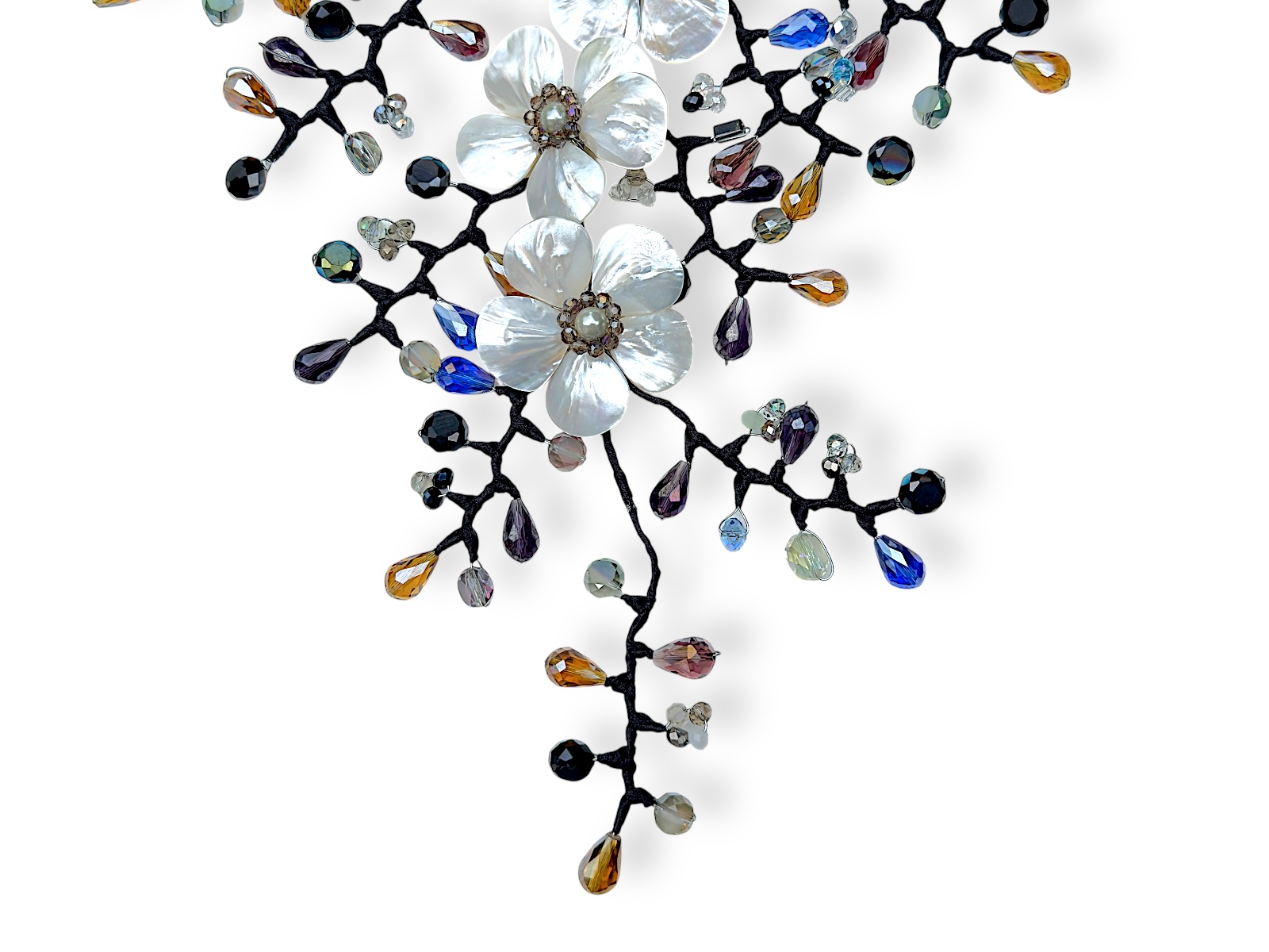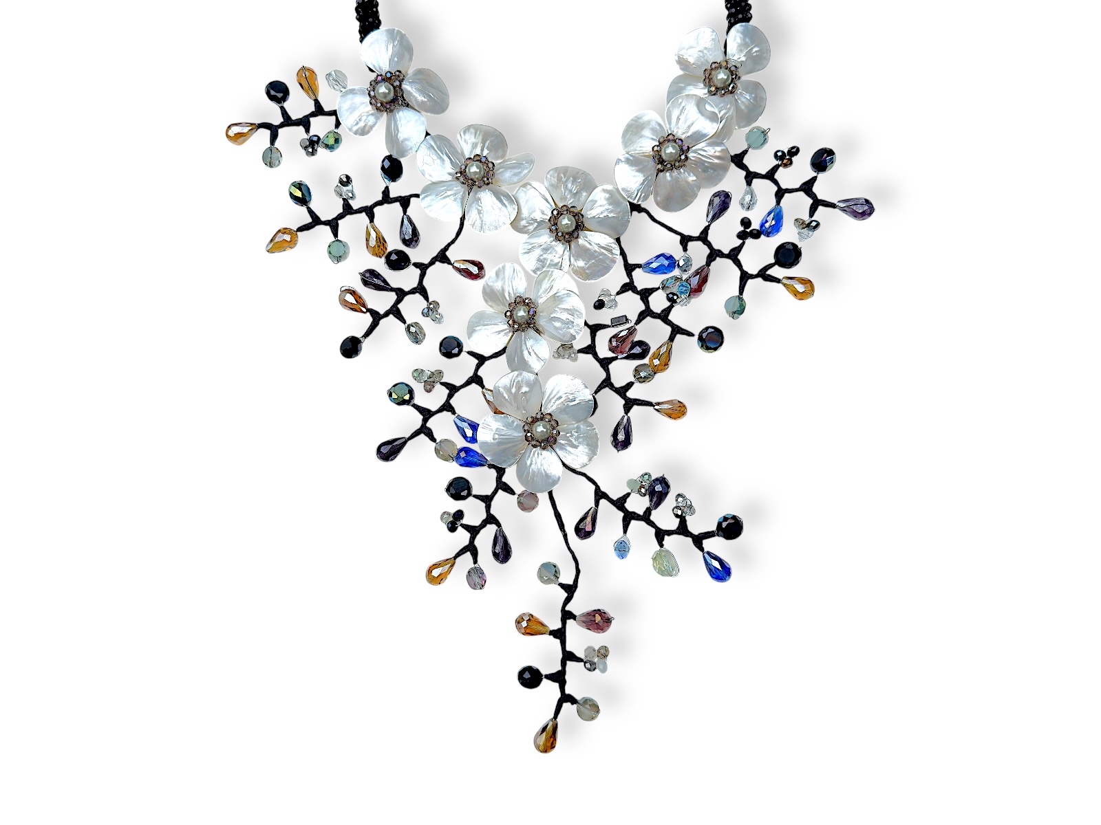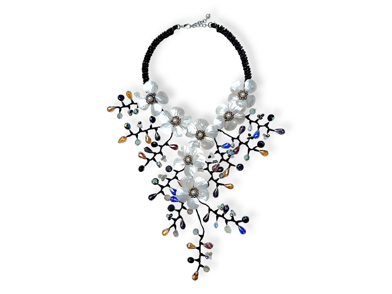 A Thai large, floral patterned necklace, of two curved bands, each covered with small black facetted Glass beads, with seven flowers, each with five petals of white Mother-Of -Pearl teardrop shaped Shells, and each with a centre of one silvered white round Glass ‘faux pearl’ bead, bordered with a circular band of small brown opalescent facetted Glass beads. There are ten black cloth covered branches, decorated with mixed shaped, sized, and coloured facetted Glass beads. Each flower is 5 cm in diameter. The necklace is 19 cm in width, and the drop length of the necklace is adjustable from 41 cm to 43 cm. The inner diameter of the necklace is adjustable from 14.5 cm to 16 cm, and the necklace is attached by a Silver Plated oyster clasp and a 6.5 cm chain, (for adjustable sizing).