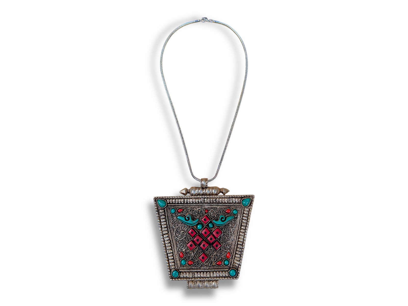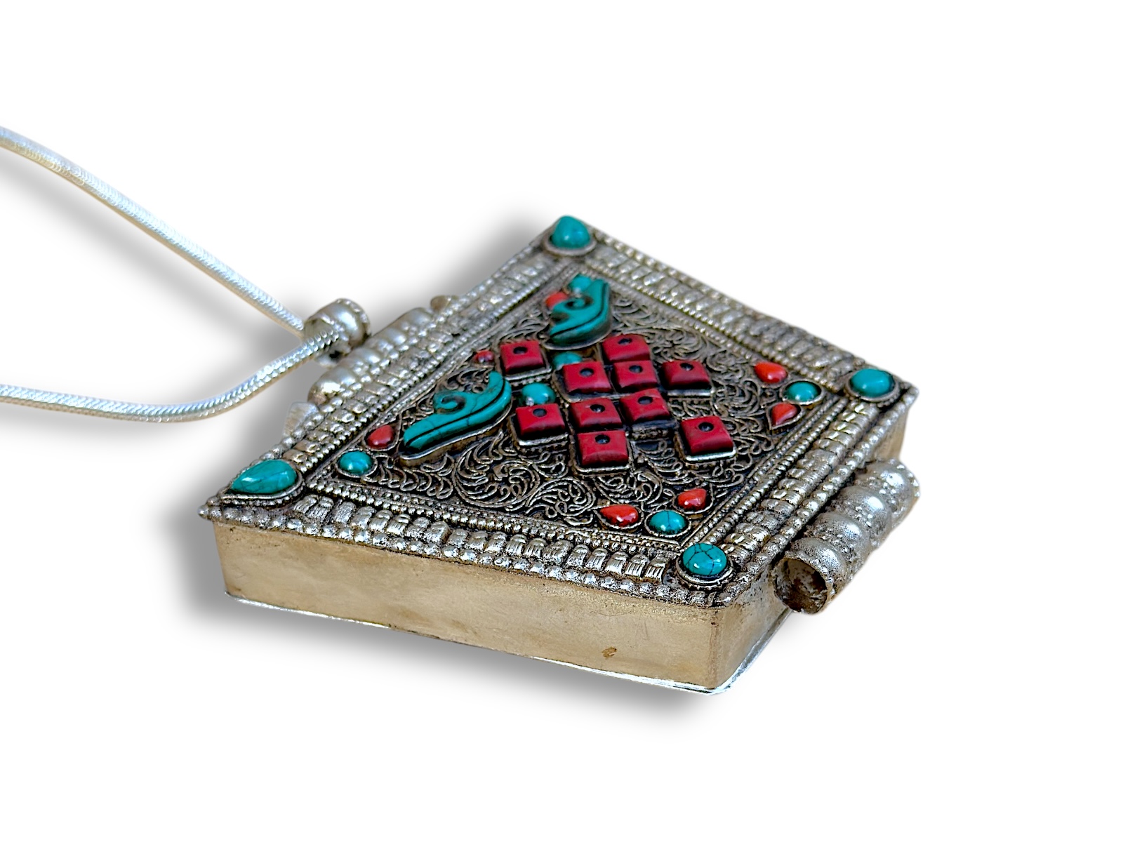 A Tibetan Silvered Metal, (Nickel free), box pendant, patterned with curved and coiled Silver Metal Plated wires, and inlaid with ten red Glass square beads, each with a small black disc in the centre of the bead, six small teardrop shaped red Glass beads, eight turquoise Howlite small round beads, two turquoise Howlite small teardrop shaped beads, and two turquoise Howlite long curled beads. The pendant is suspended, by a Silvered Metal long patterned tube, from a Silvered Metal long chain necklace. The box pendant is 10 cm in width, 1.8 cm in depth, and 11 cm in drop length. The chain and pendant have a total drop length of 33.5 cm, and the chain disc attached, at the top, by a Silver Plated oyster clasp and ring.