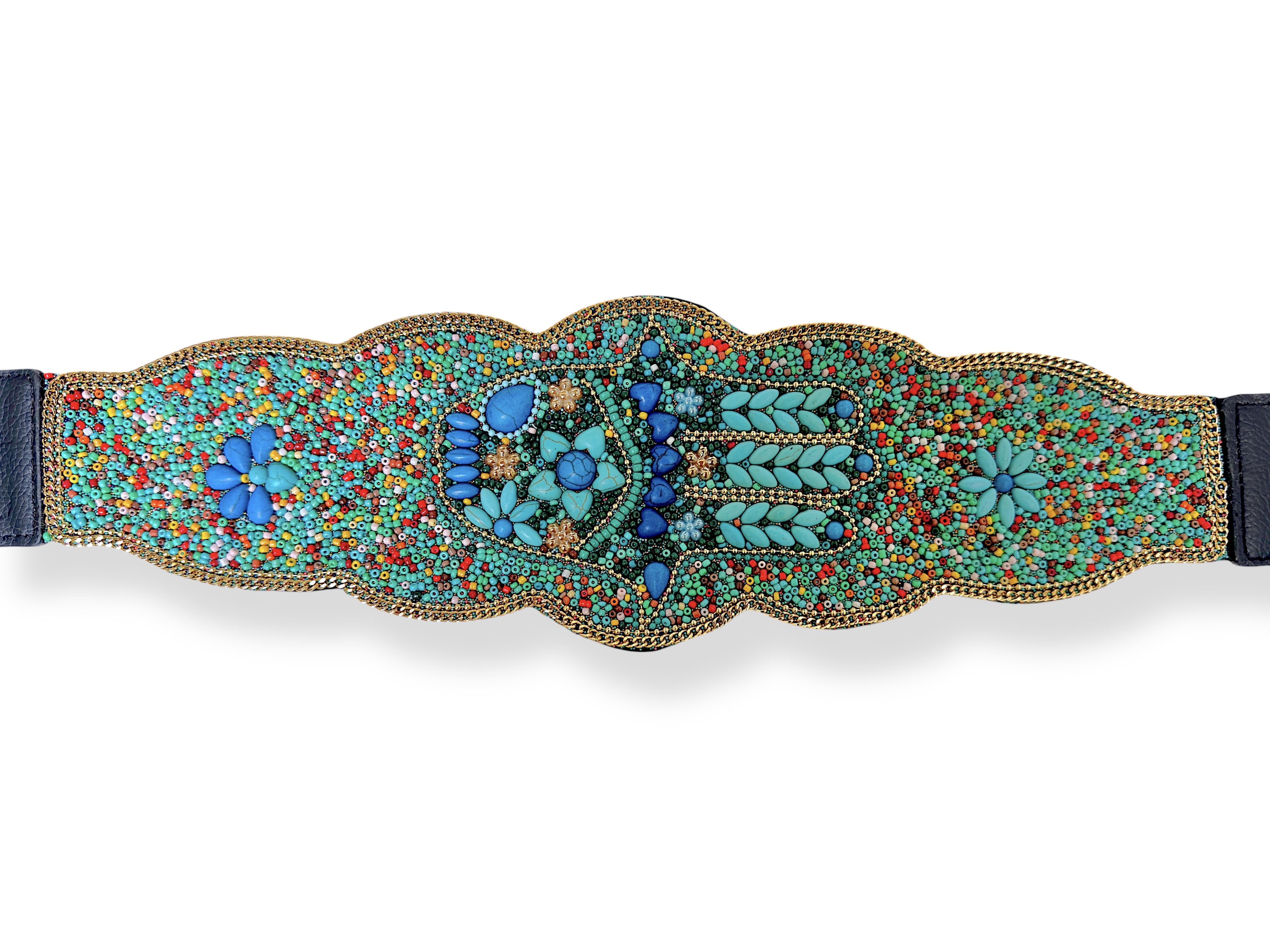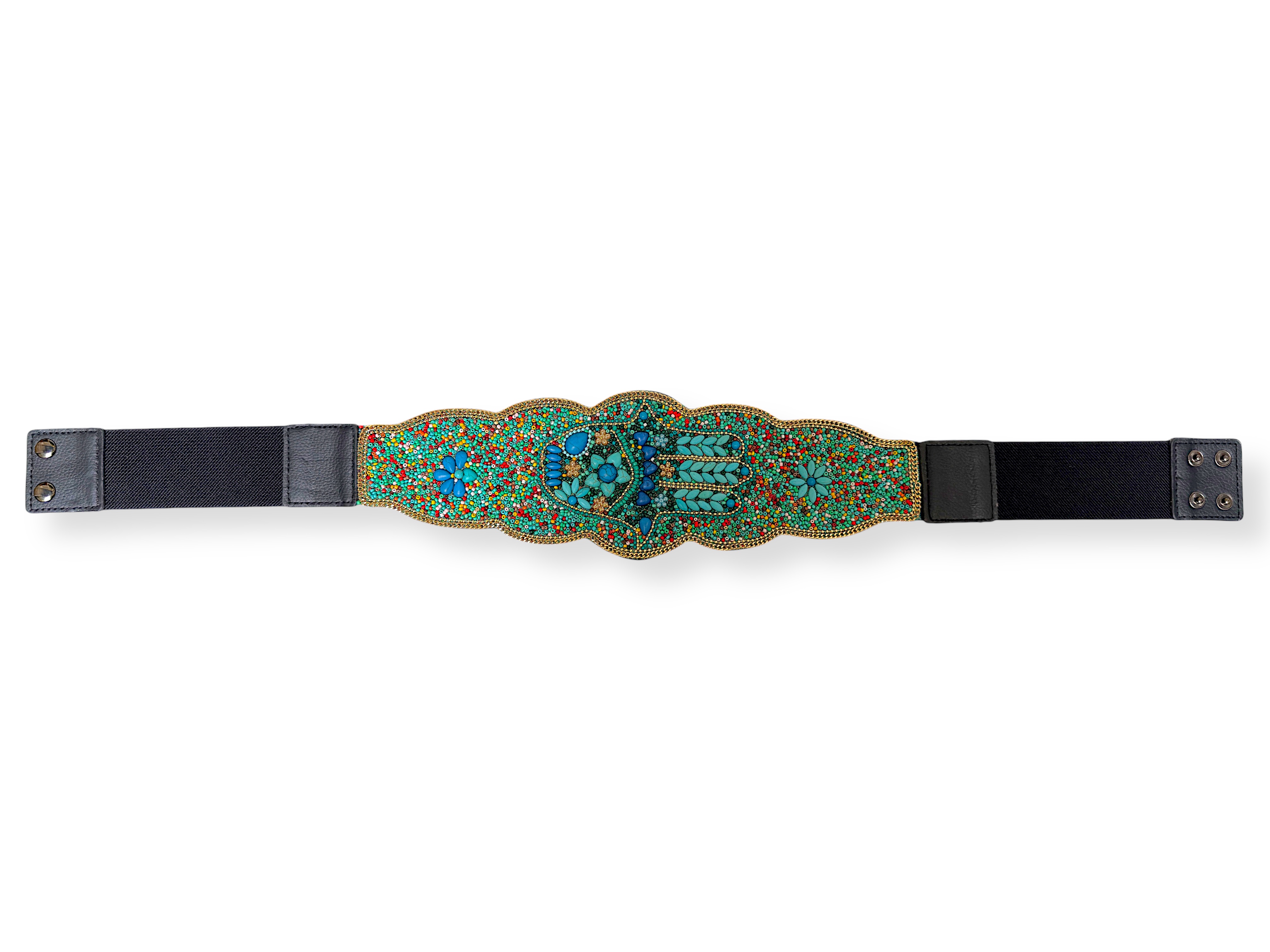 A wide elasticated black band belt, with a long wavy borders panel, patterned with mixed shaped and sized multicoloured Resin beads, and lines and borders of small Golden Resin beads. At the centre of the panel is a large hand, decorated with  light and dark blue Resin oval, round, and heart shaped beads, three flowers of small golden Resin round ‘faux pearls’, and borders and lines of golden Resin small round beads. On each side of the hand is a flower of light and dark blue oval beads.