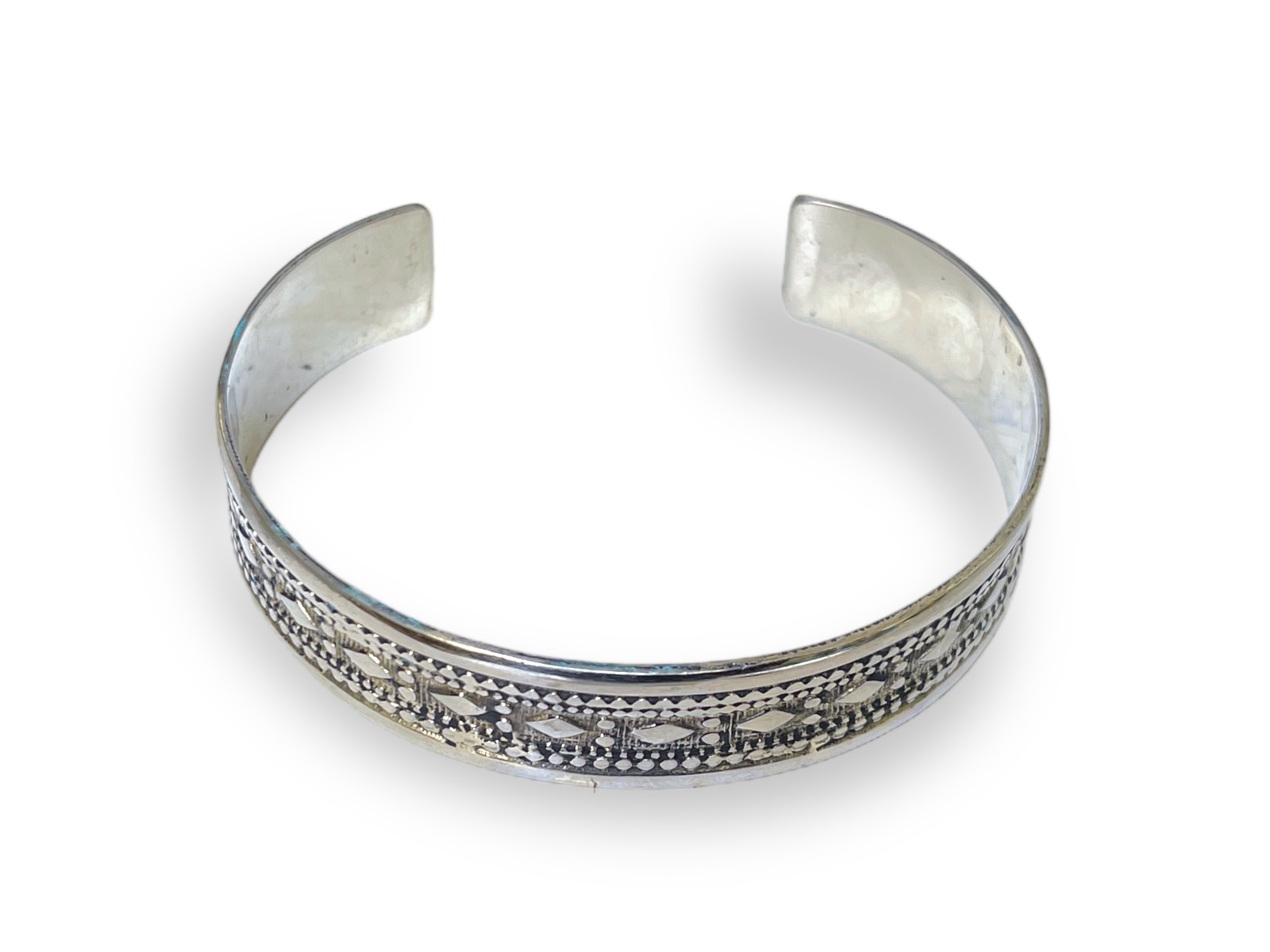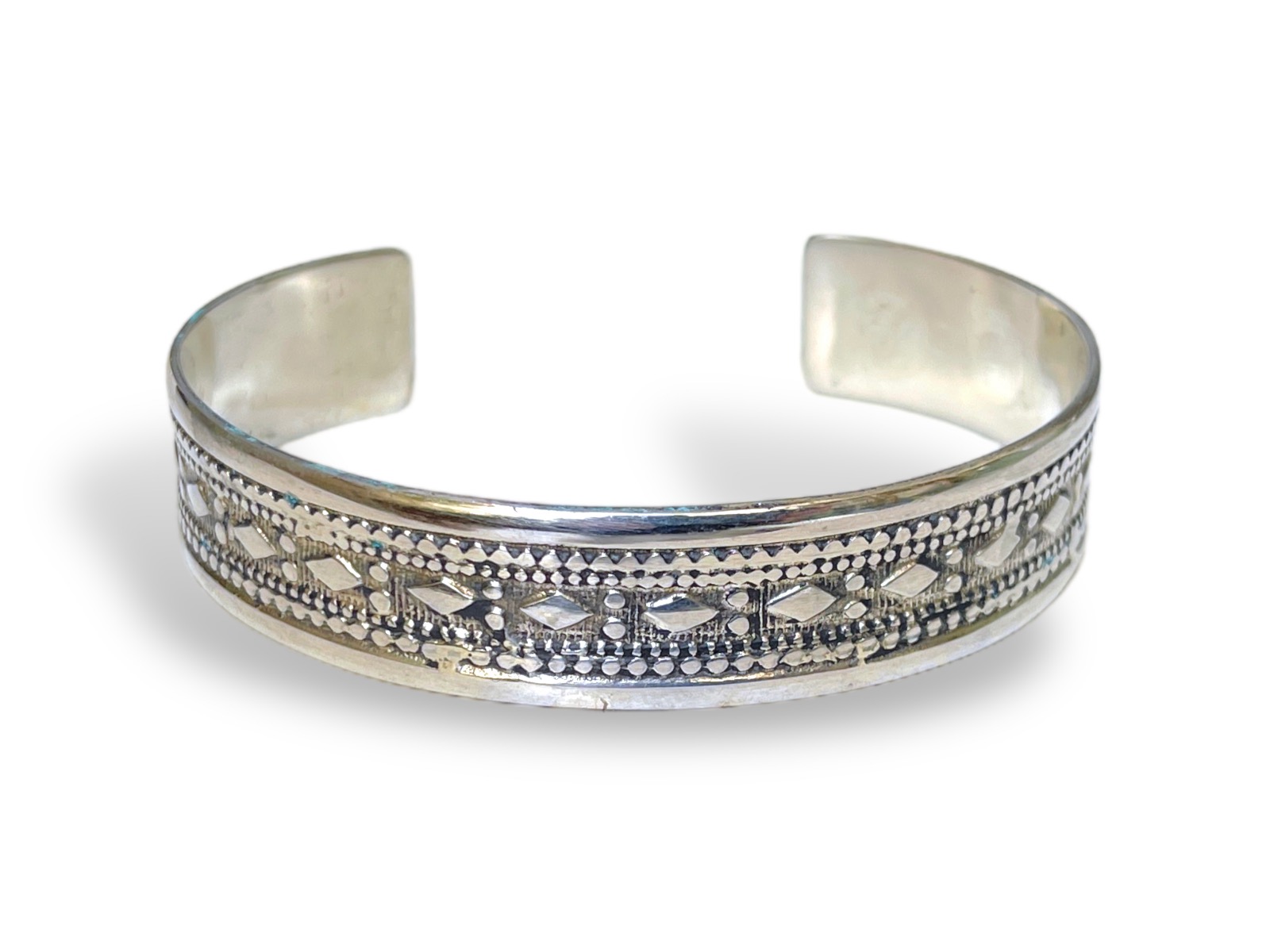 An Afghan Silver Plated narrow open cuff. The central band of the cuff is patterned with Silver Plated diamond shaped panels and small discs, and is bordered, on each side with a row of small triangular shaped panels and a row of small round beads.