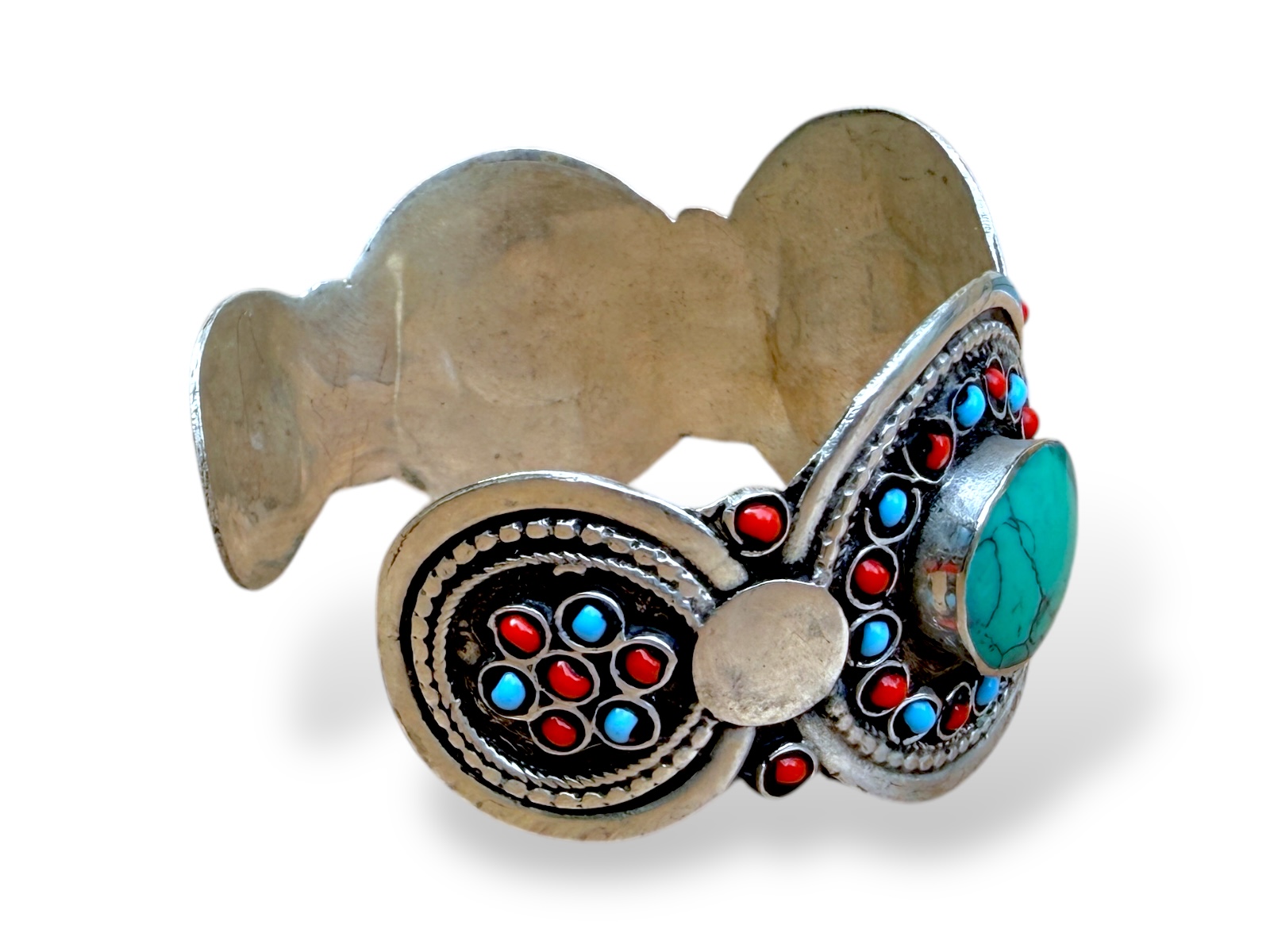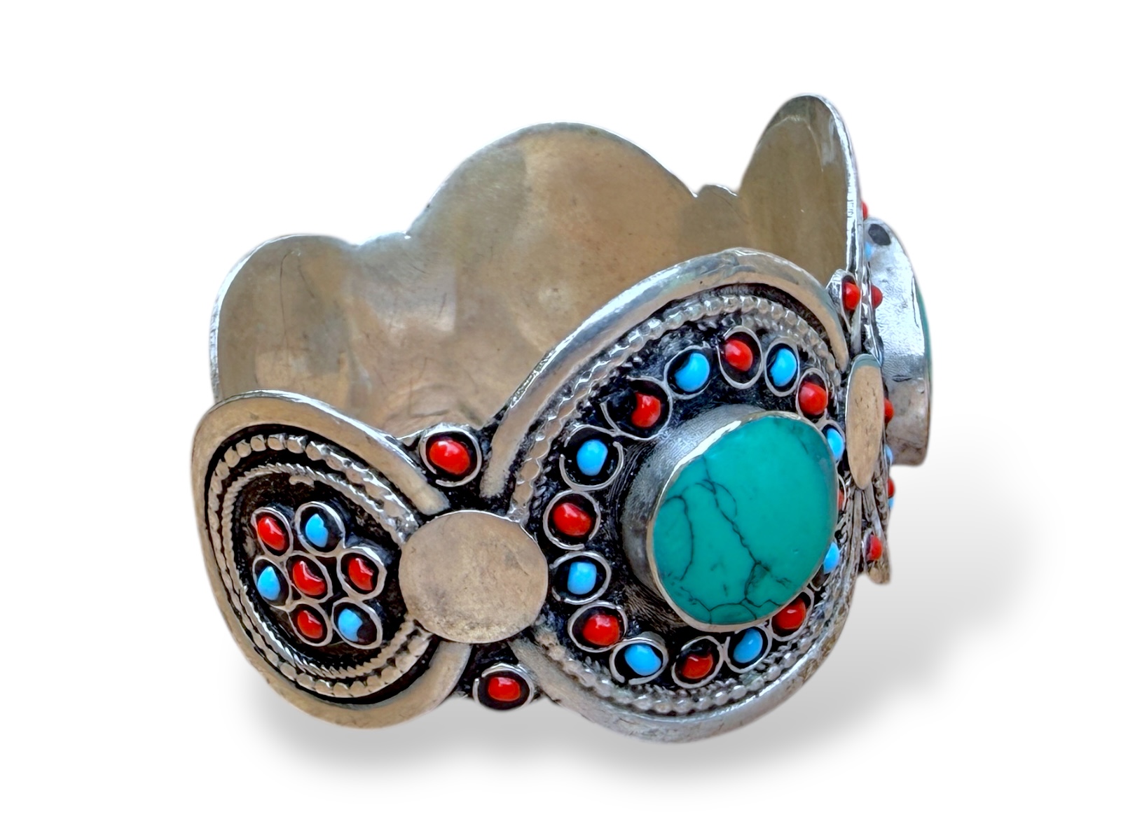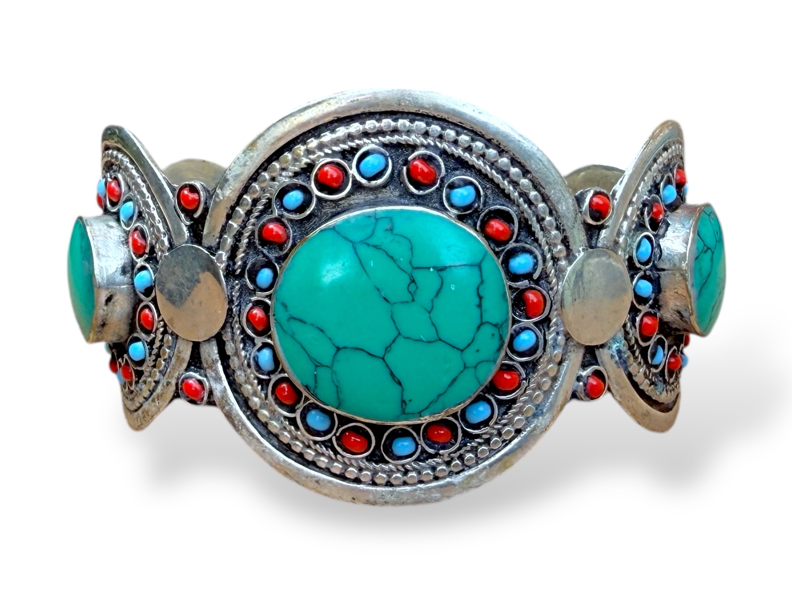 An Afghan Silver Plated open cuff, with three large Silver Plated panels, each inlaid with a large turquoise dyed Howlite domed circular bead, set in a Silver Plated case, and bordered with small red and light blue round Glass beads, and two small circular panels, each inlaid with three small light blue round Glass beads, and four small red round Glass beads, each bordered with a Silver plated band. The large central circular panel is 4.2 cm in diameter, and the two small circular panels are, each, 2.5 cm in diameter. The inner diameter of the cuff is 7 cm, and is adjustable in size.