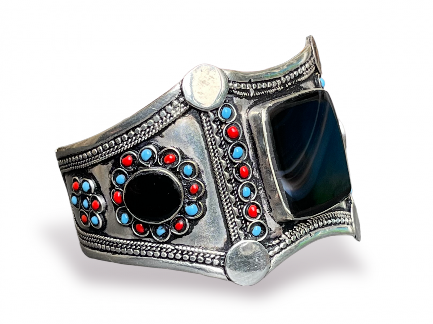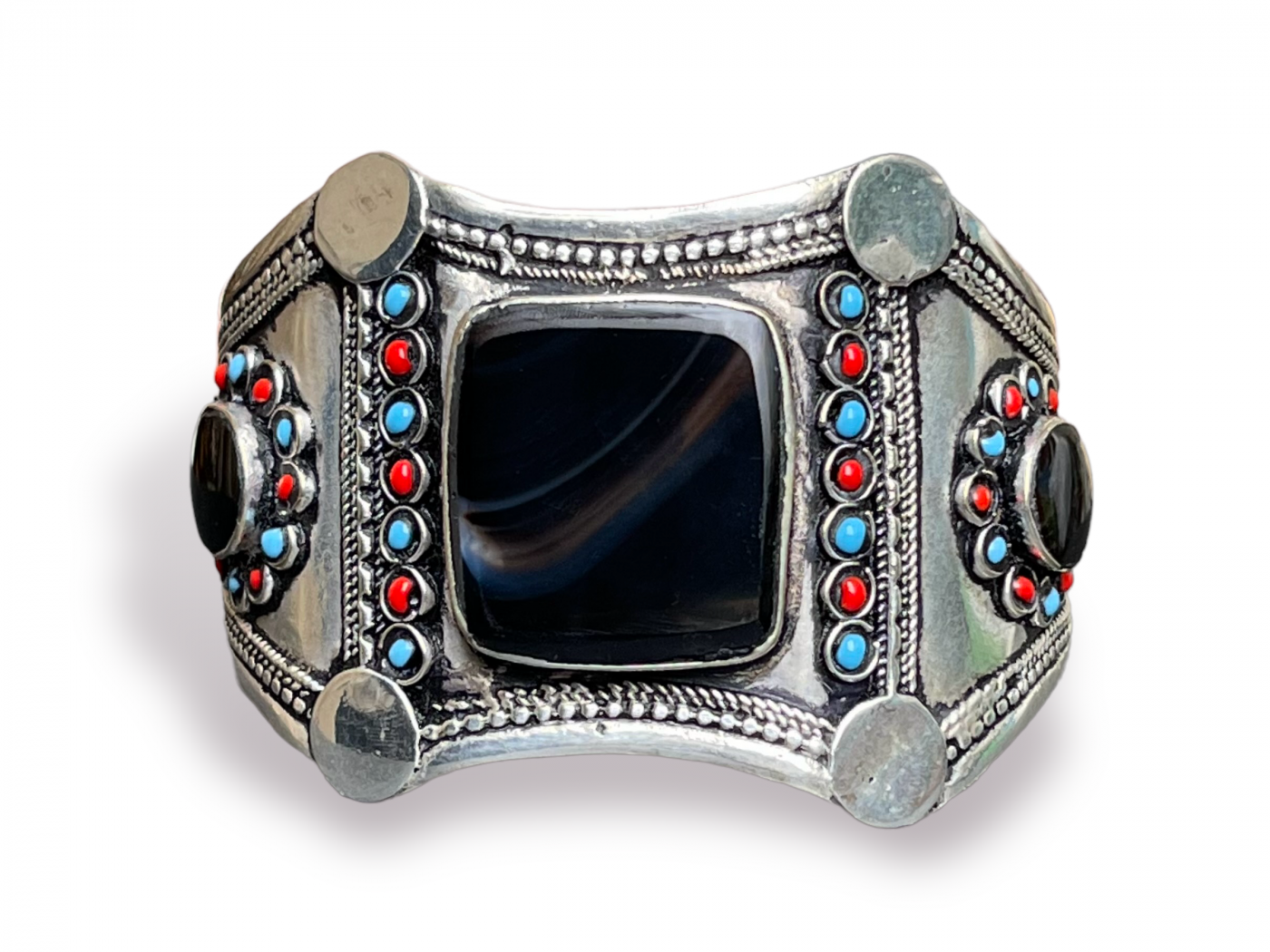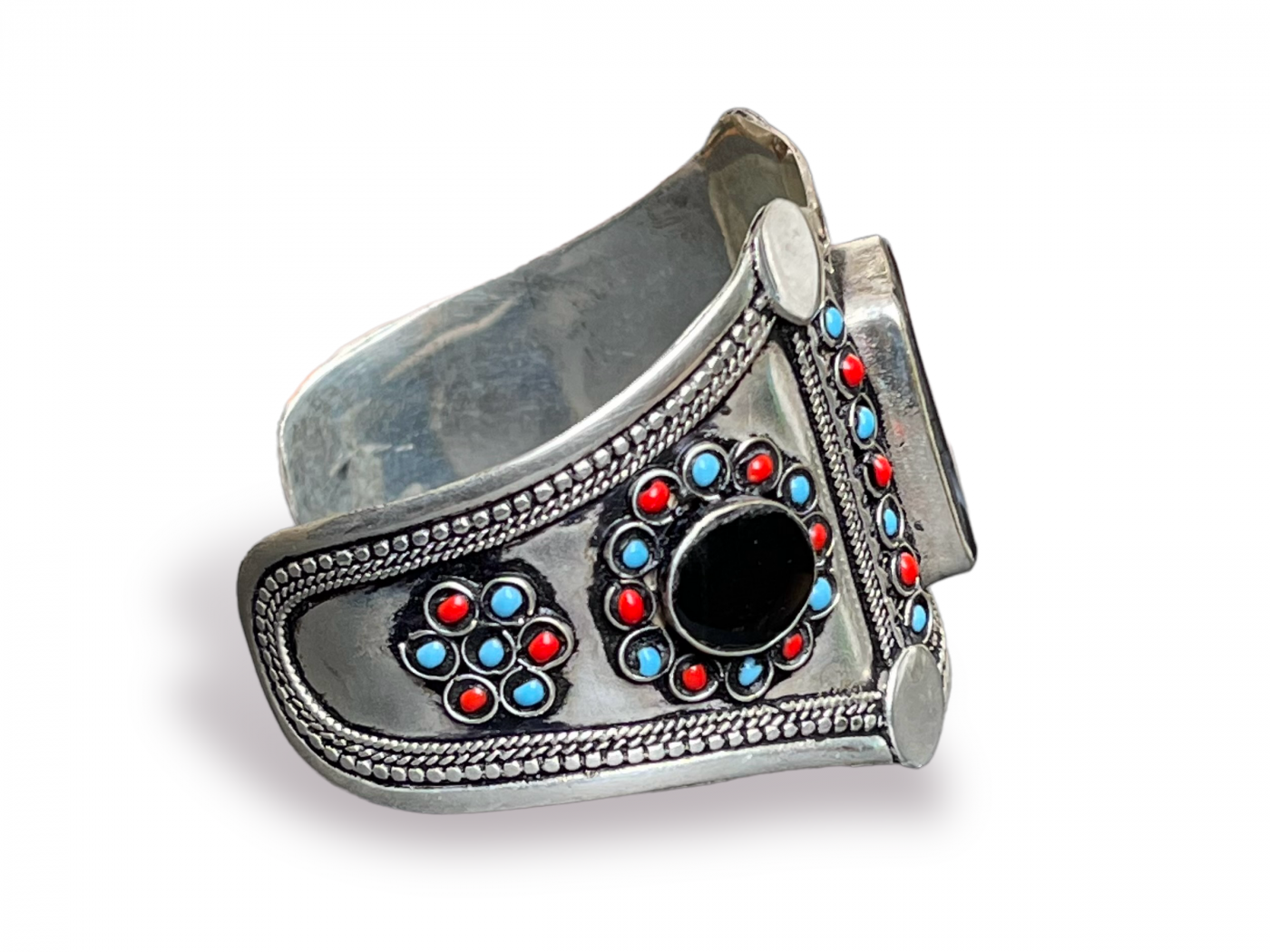 An Afghan Silver Plated patterned open cuff. At the centre of the cuff is a large Black Agate raised panel set in a Silver Plated frame, and decorated, on each side ,with a band of small red and turquoise Glass beads. On each side of the cuff is a Black Agate domed circular panel, bordered with small red and turquoise Glass beads, and a circular floral patterned panel, of small red and turquoise small Glass beads, each set in a Silver Plated ring.