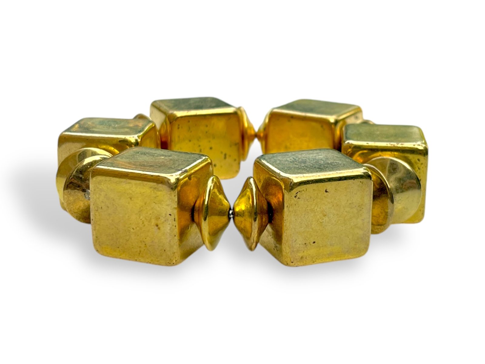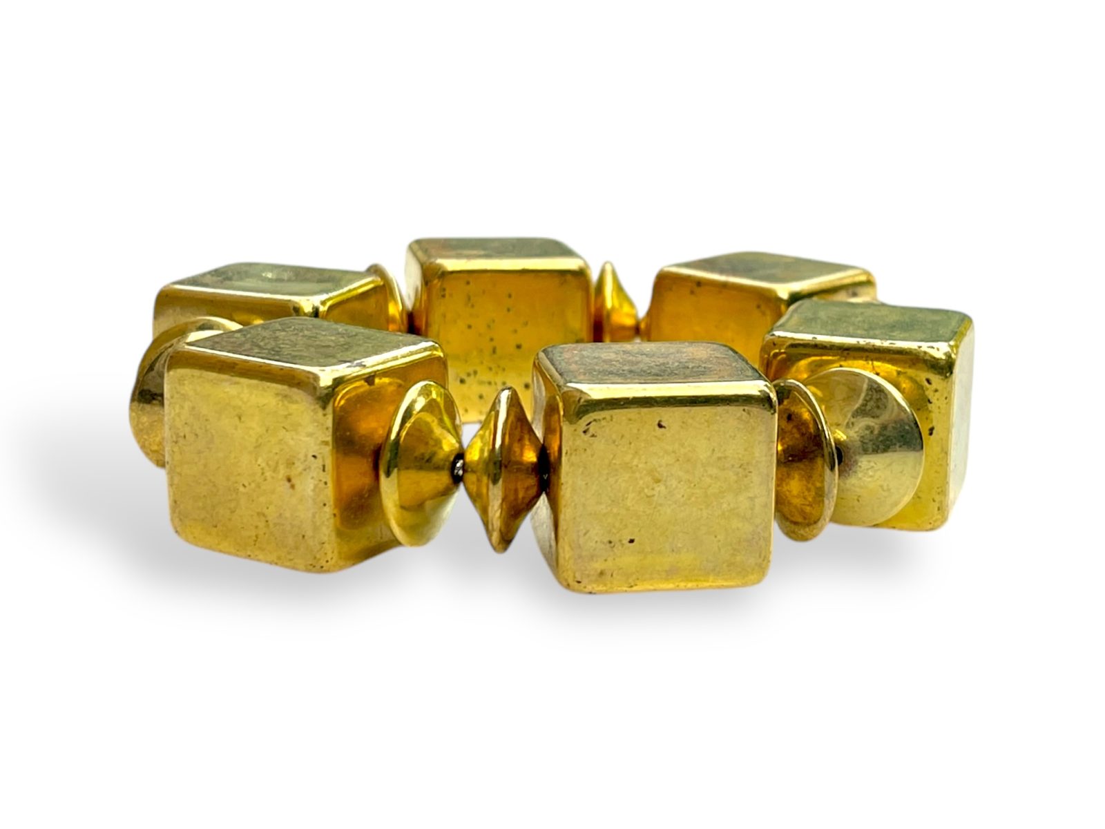 An elasticited bracelet of six large hollow Golden Metal square beads with smooth rounded edges, and twelve small biconic ridged circular beads. The square beads are 2 cm in width, length, and depth, and the bi-cone beads are 1.5 cm in diameter and 0.7 cm in width. The inner diameter of the bracelet is 5 cm and is adjustable in size.