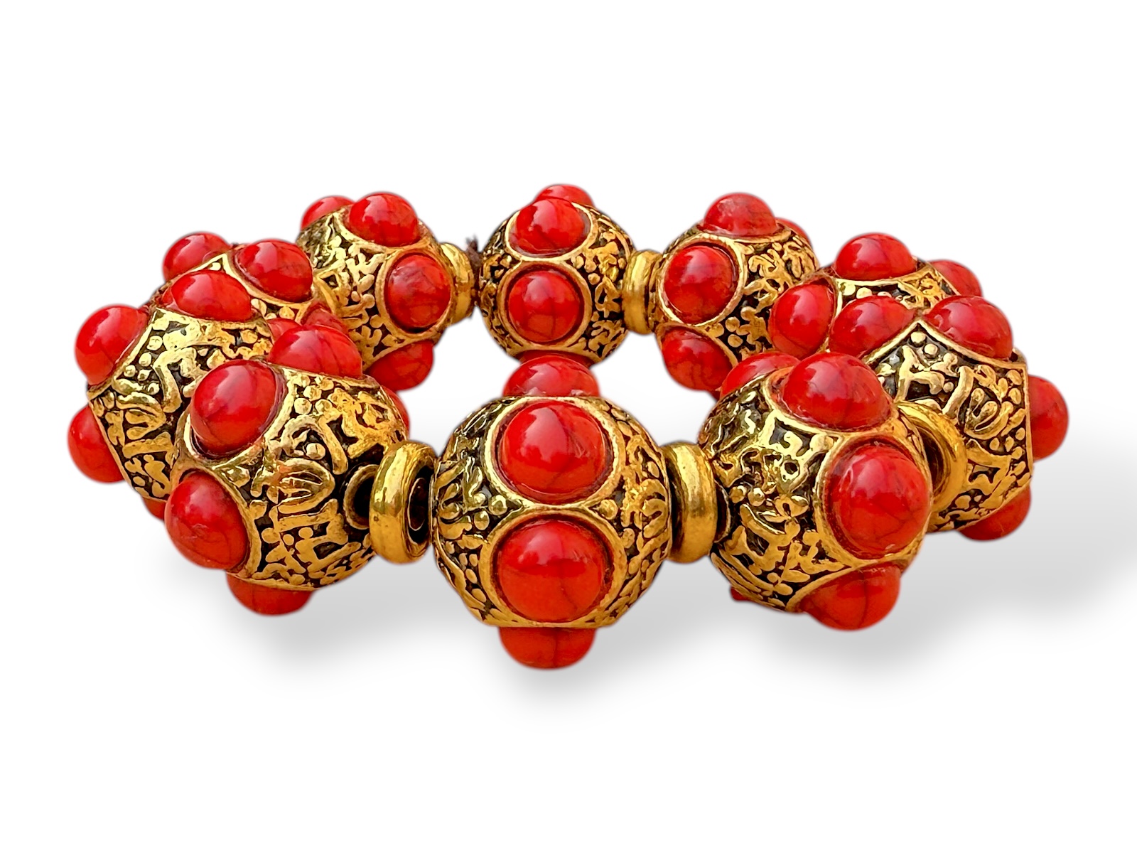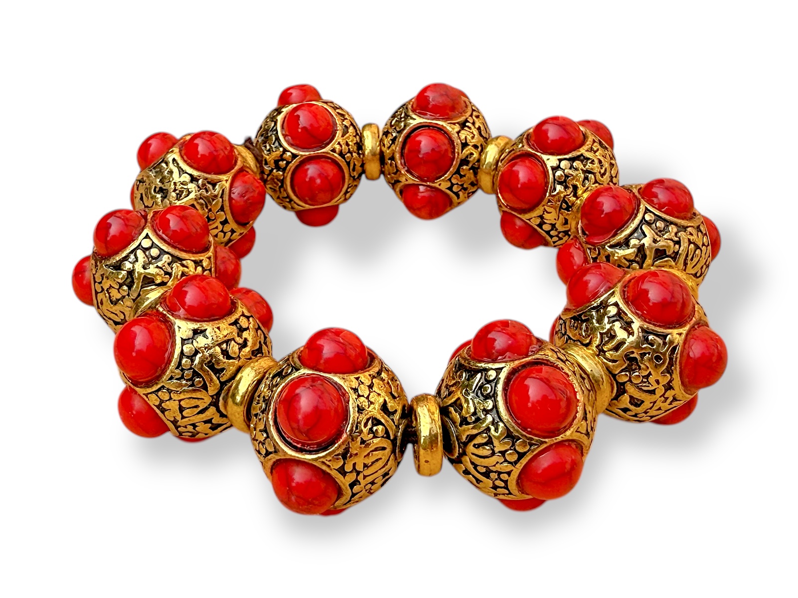 An elasticated bracelet of ten Gold Plated large patterned beads, each inlaid with six small red dyed Howlite round beads. Between each Gold Plated bead is a small Gold Plated ring spacer bead. Each large Gold Plated bead is 2 cm in diameter and 1.5 cm in width. The inner diameter of the elasticated bracelet is 5 cm, and is adjustable in size.