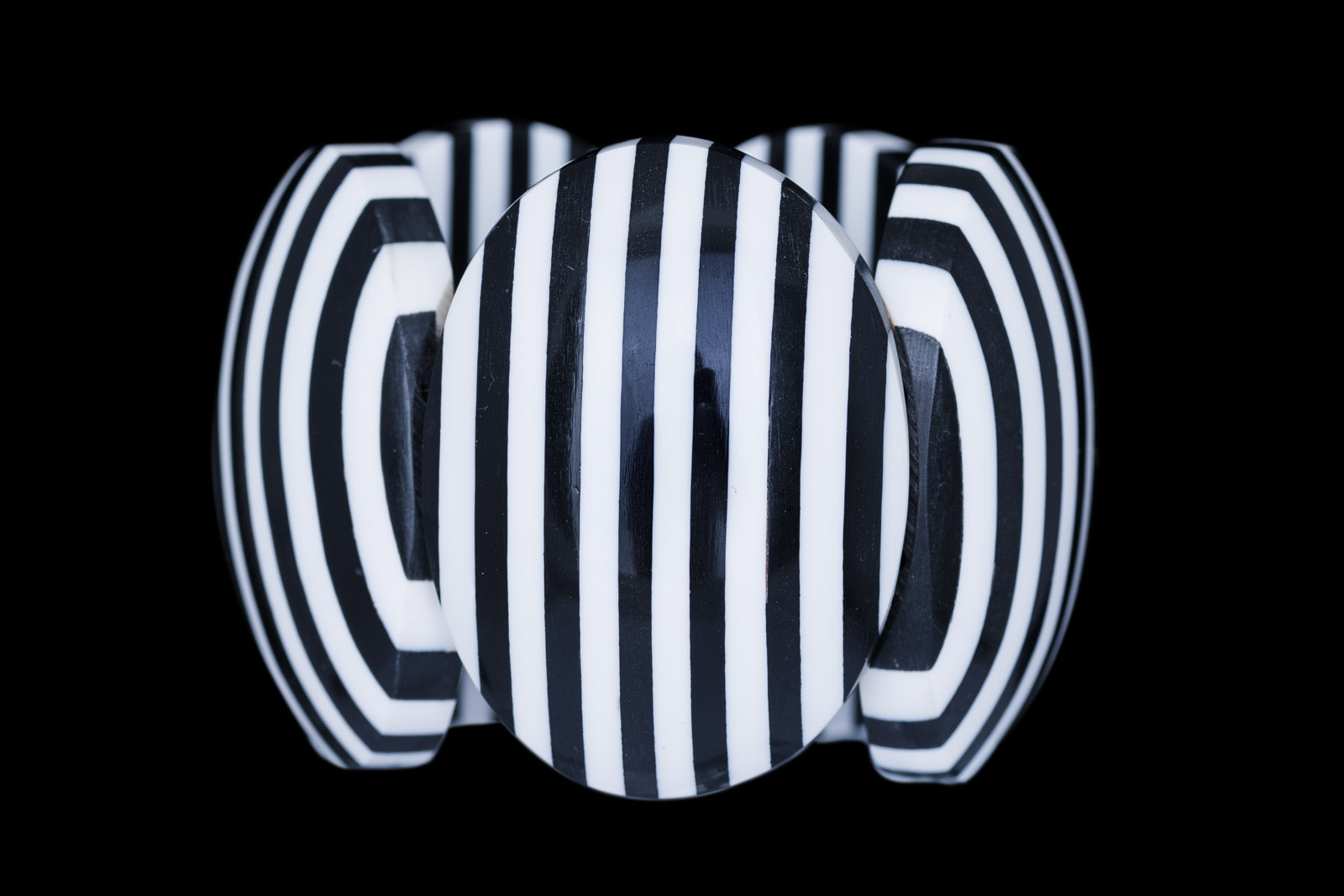 An elasticated cuff of five black and white striped domed oval Resin panels. Each panel is 1.3 inches in width, 0.3 inches in depth, and 2.3 inches in length. The inner diameter of the cuff is 2 inches, and the diameter is adjustable.