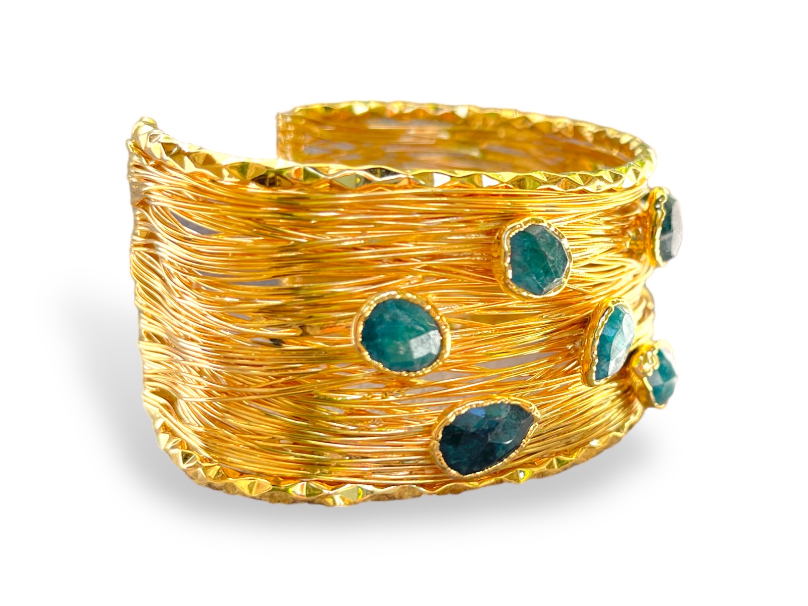 An Indian Gold Plated wires open cuff, decorated with ten domed facetted Emerald teardrop cabochons, each set in a raised Gold Plated frame. The cuff is bordered with two Gold Plated facetted bands. The cuff is 3.5 cm in width, and the inner diameter of the cuff is 6.5 cm, and is adjustable in size.
