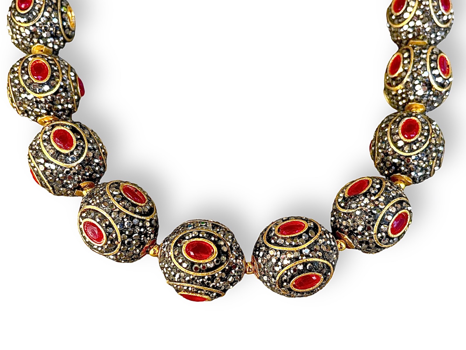 An Indian necklace of sixteen round beads, each decorated with inlays of small facetted Marcasites, red Glass facetted oval beads set in Brass oval band borders. Between each bead is a small round Brass spacer. The beads are suspended two golden metal braided wire bands. Each bead is 2 cm in diameter. The length of the necklace is adjustable from 47 cm in length to 82 cm in length, and the length can be adjusted by raising or lowering the red Glass sliding toggle.